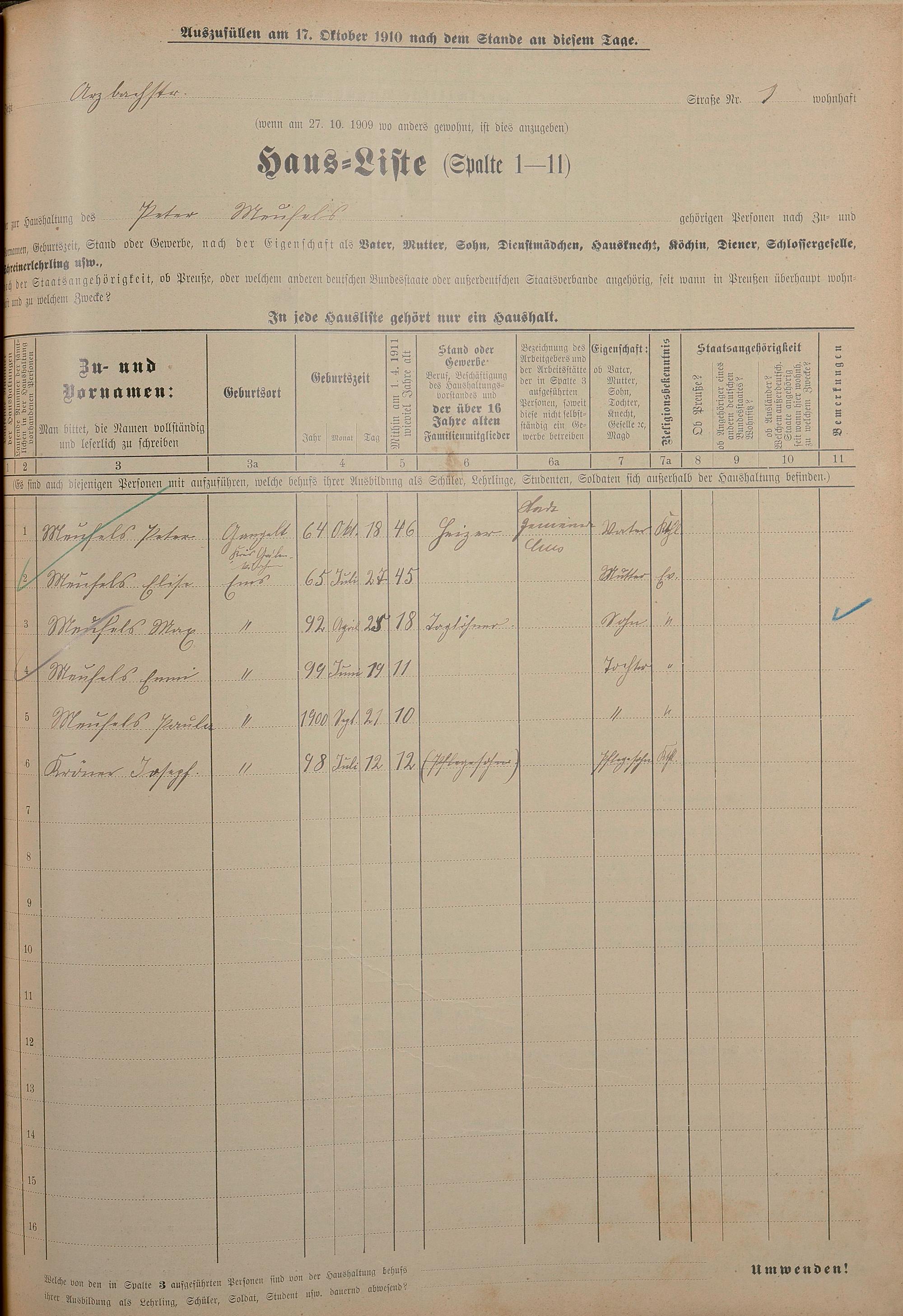 Personenstandsaufnahme zur Klassensteuerrolle für 1910