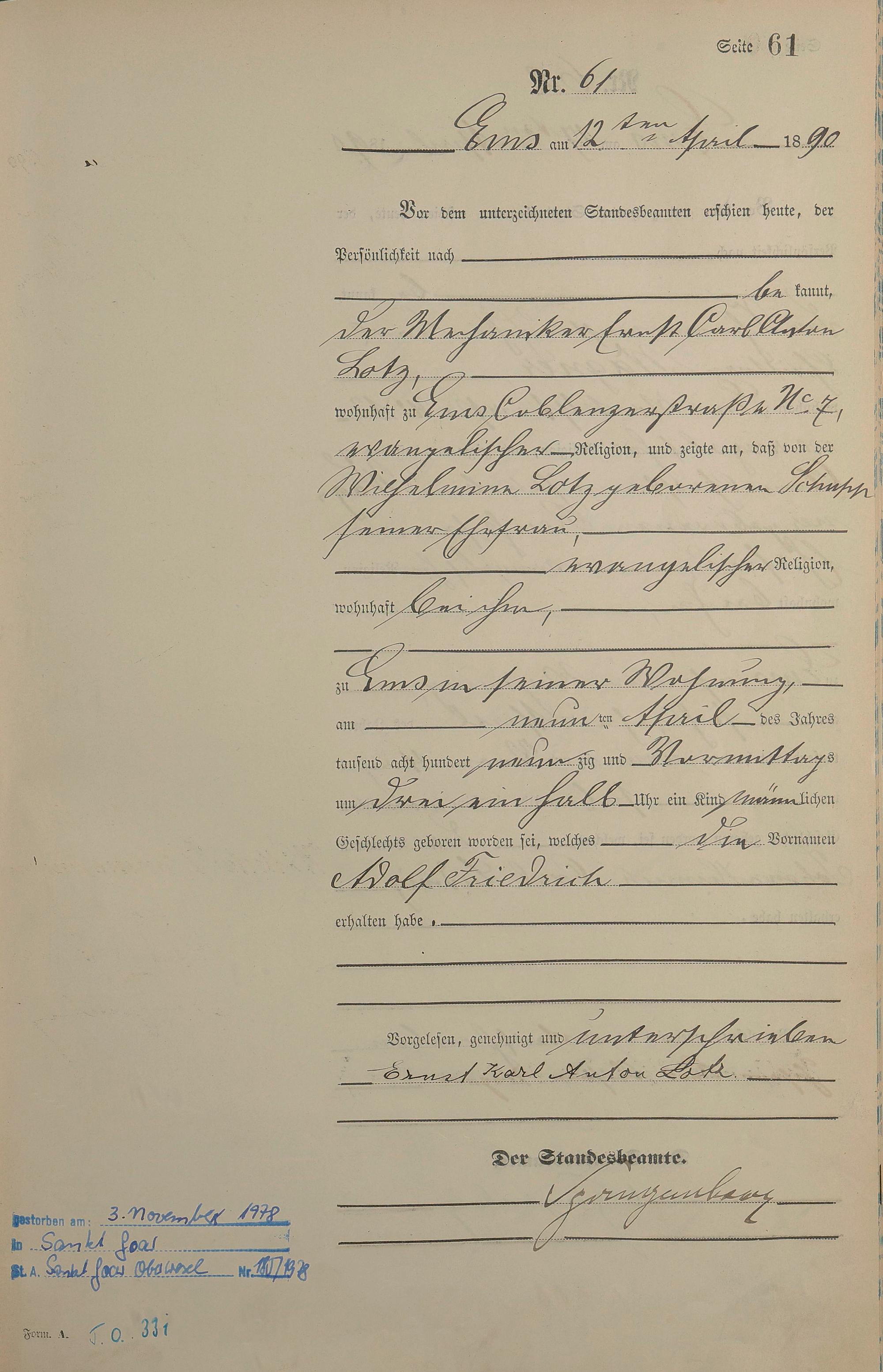 Geburtsregister 1890