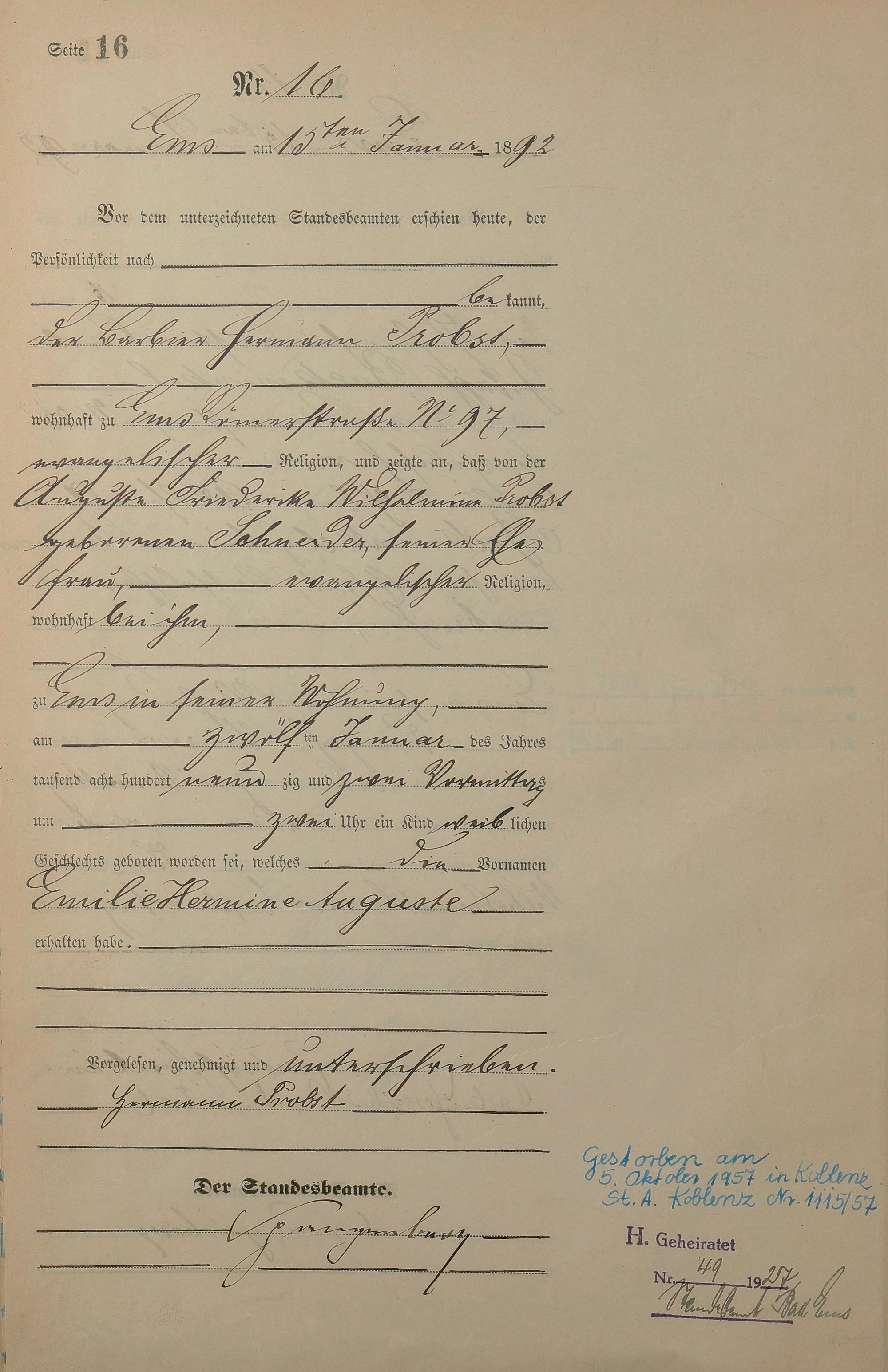 Geburtsregister 1892