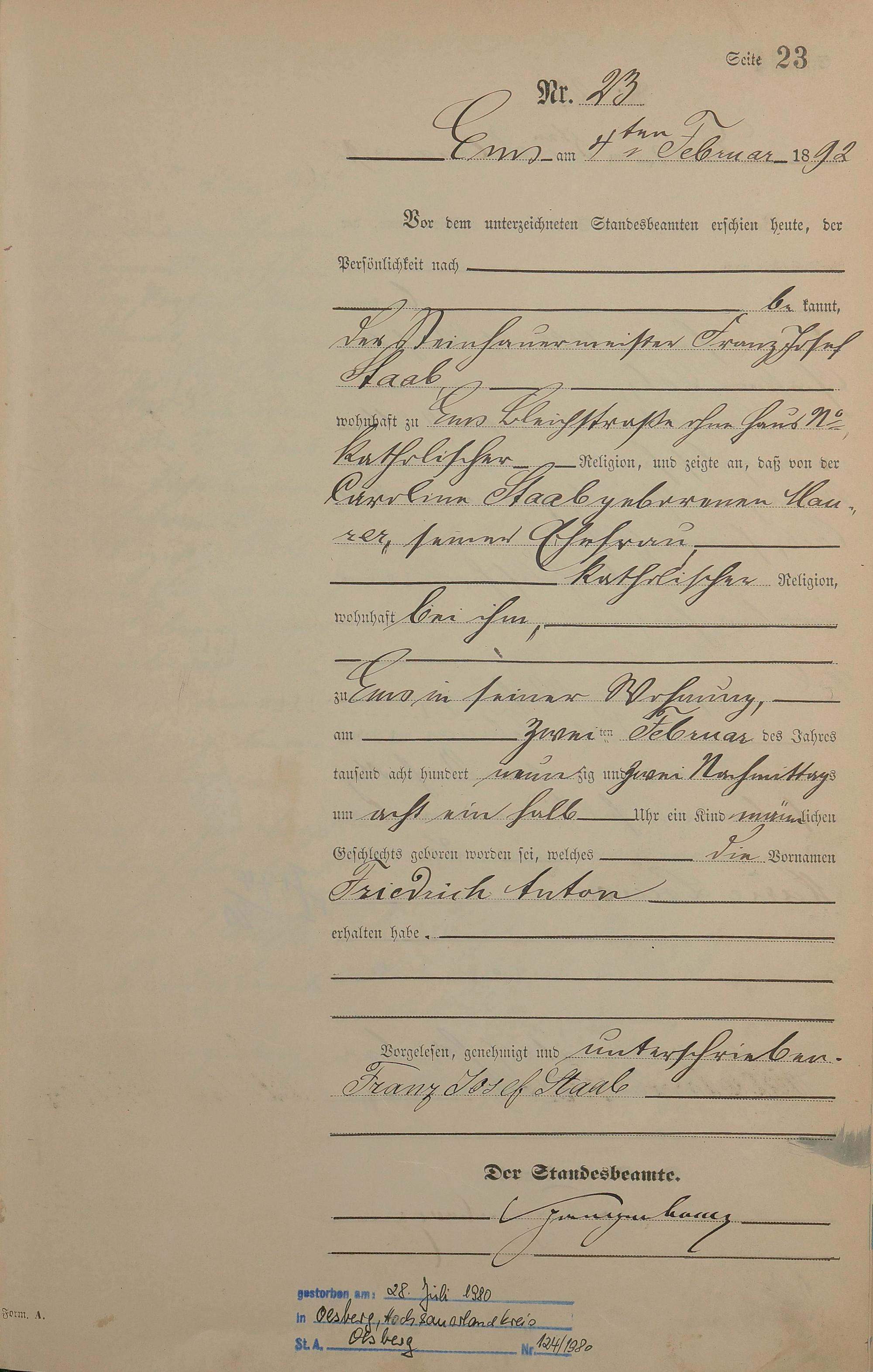 Geburtsregister 1892