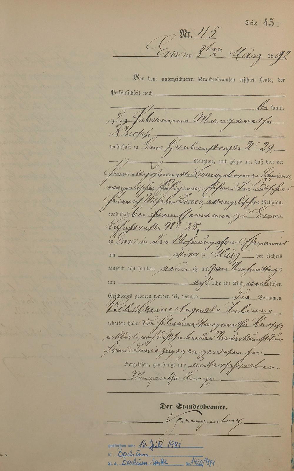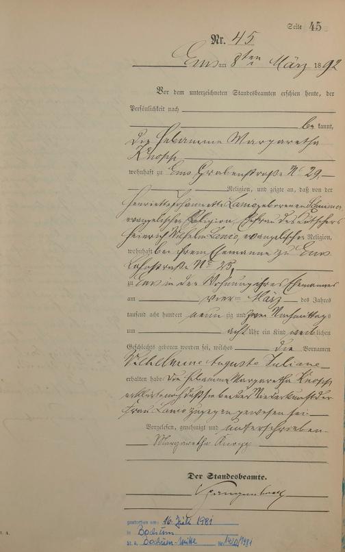 Geburtsregister 1892
