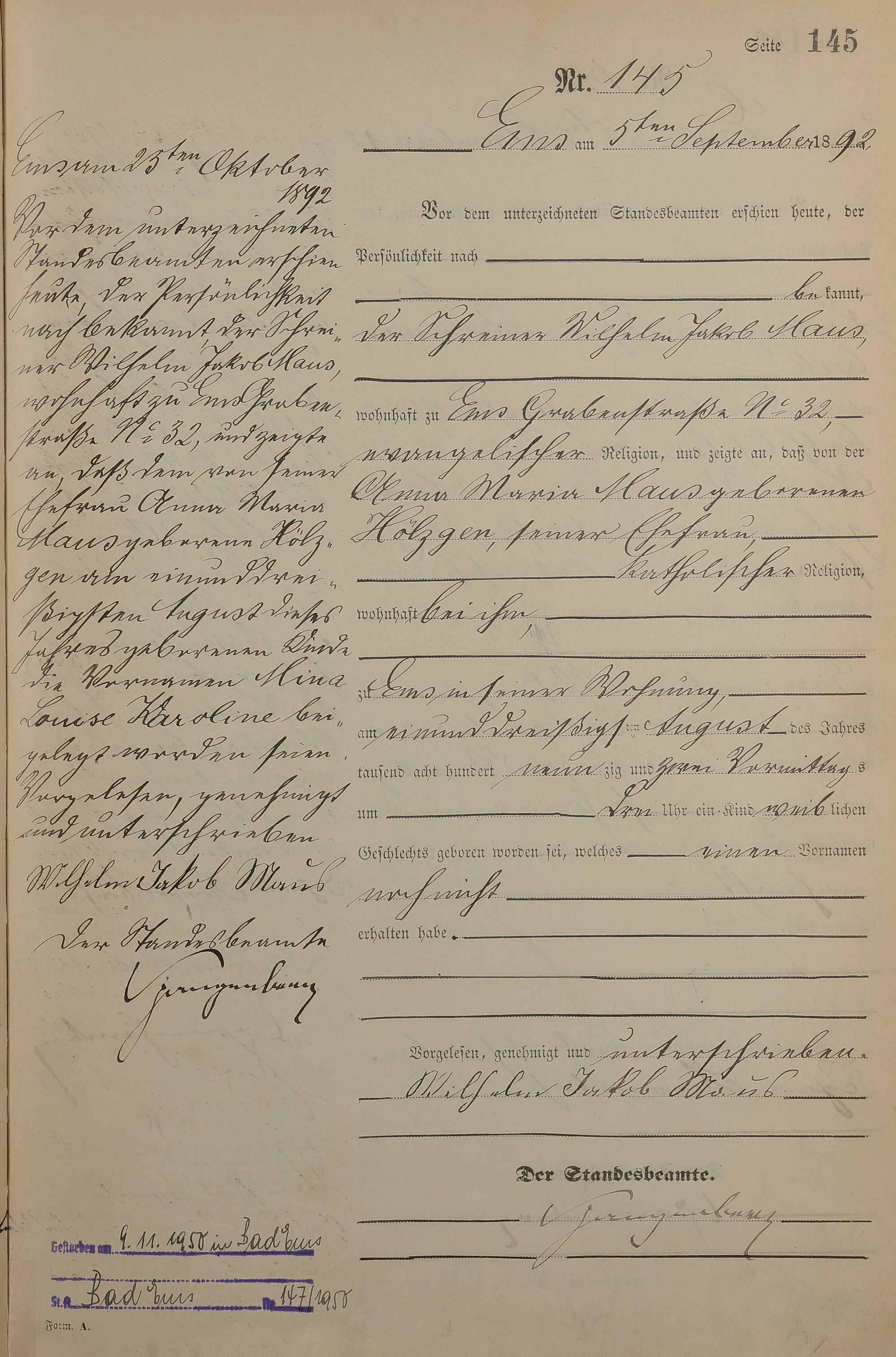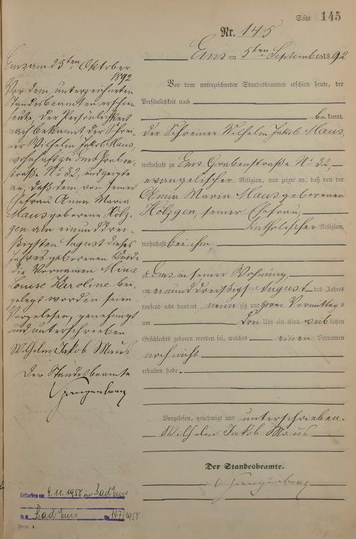 Geburtsregister 1892