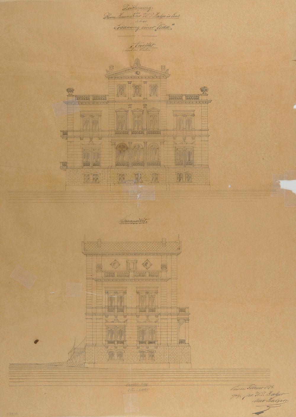 Wohnhausentwurf des Hauses "Quisisana" des W. J. Balzer/Heinrich Sommer und Paula geb. Belzer/Dr. Karl Heinrich Sommer und Martha geb. Huth/Hans Sommer und Frieda geb. Köppen Wihelmsallee Nr. 24 (12) Flur 94 Nr. 19 - Ansichten