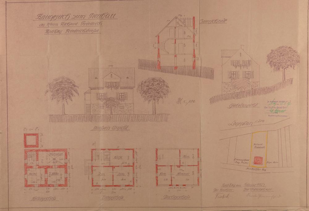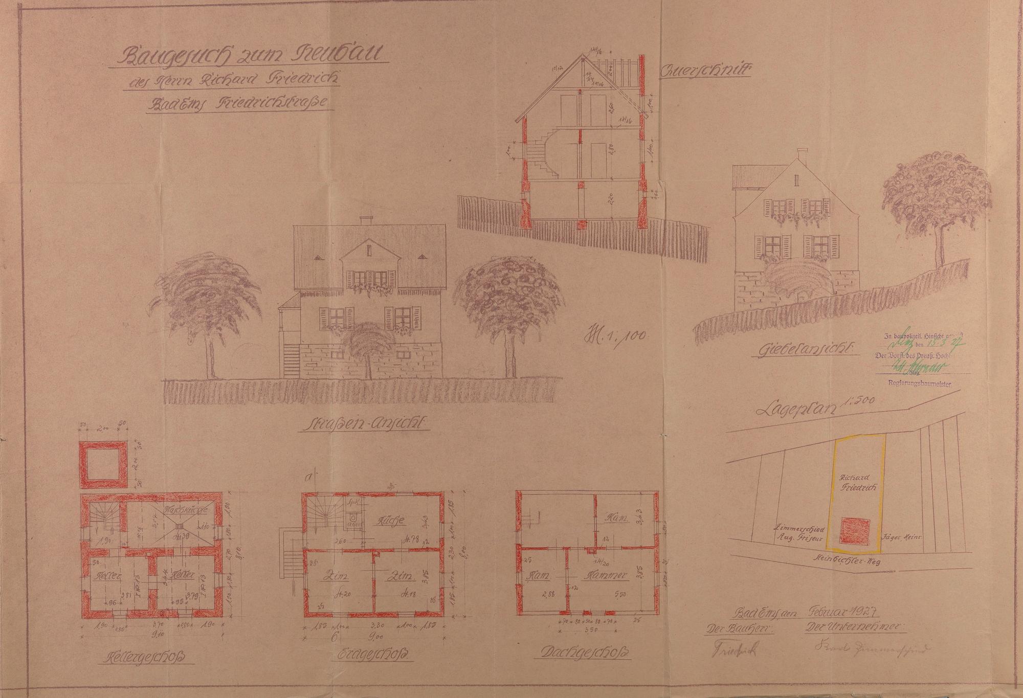 Wohnhaus des Richard Friedrich/Anton Heinrich Thorn und Auguste Luise geb. Friedrich Bad Ems Steinbichler Weg Nr. 11 Flur 48 Nr. 12/2 (Nachtrag) - Ansichten, Schnitt, Grundrisse und Lageplan