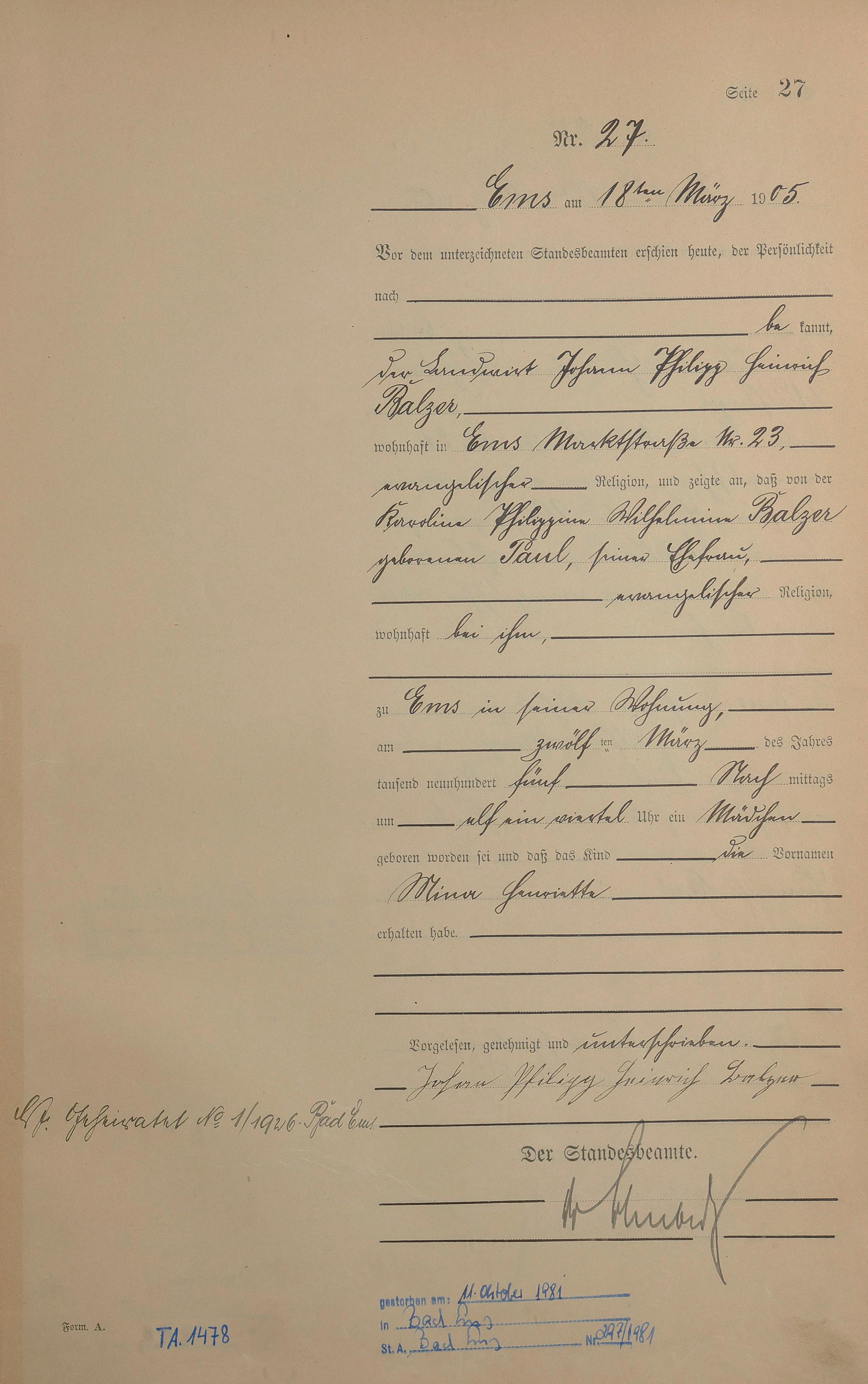 1281: Geburtsregister 1905