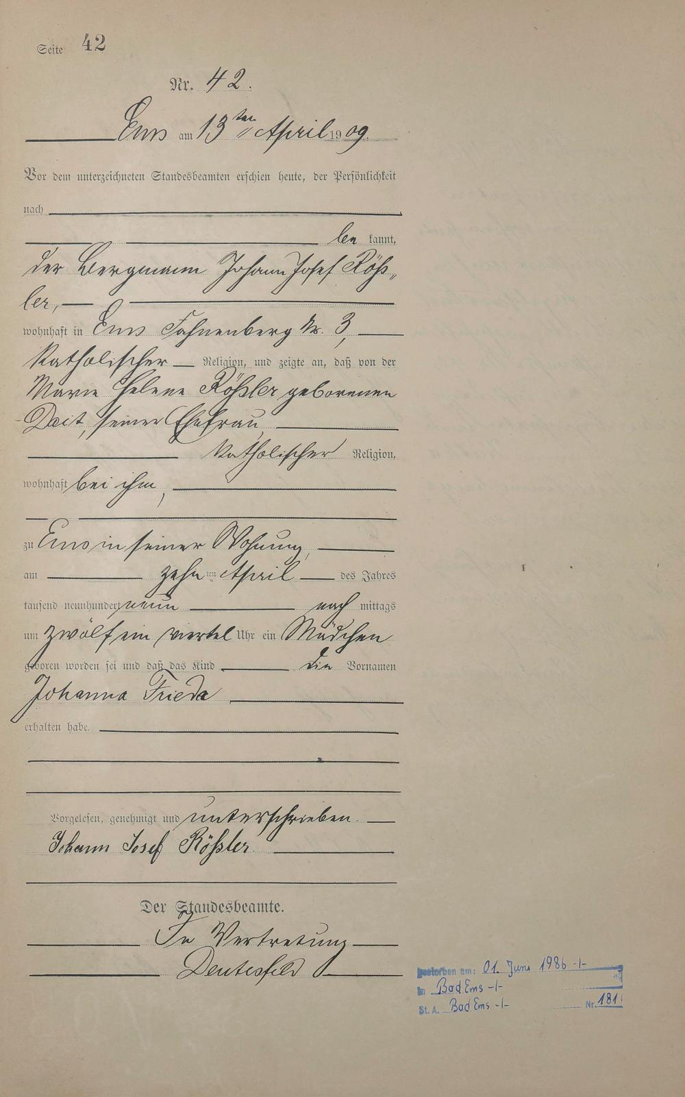 1285: Geburtsregister 1909