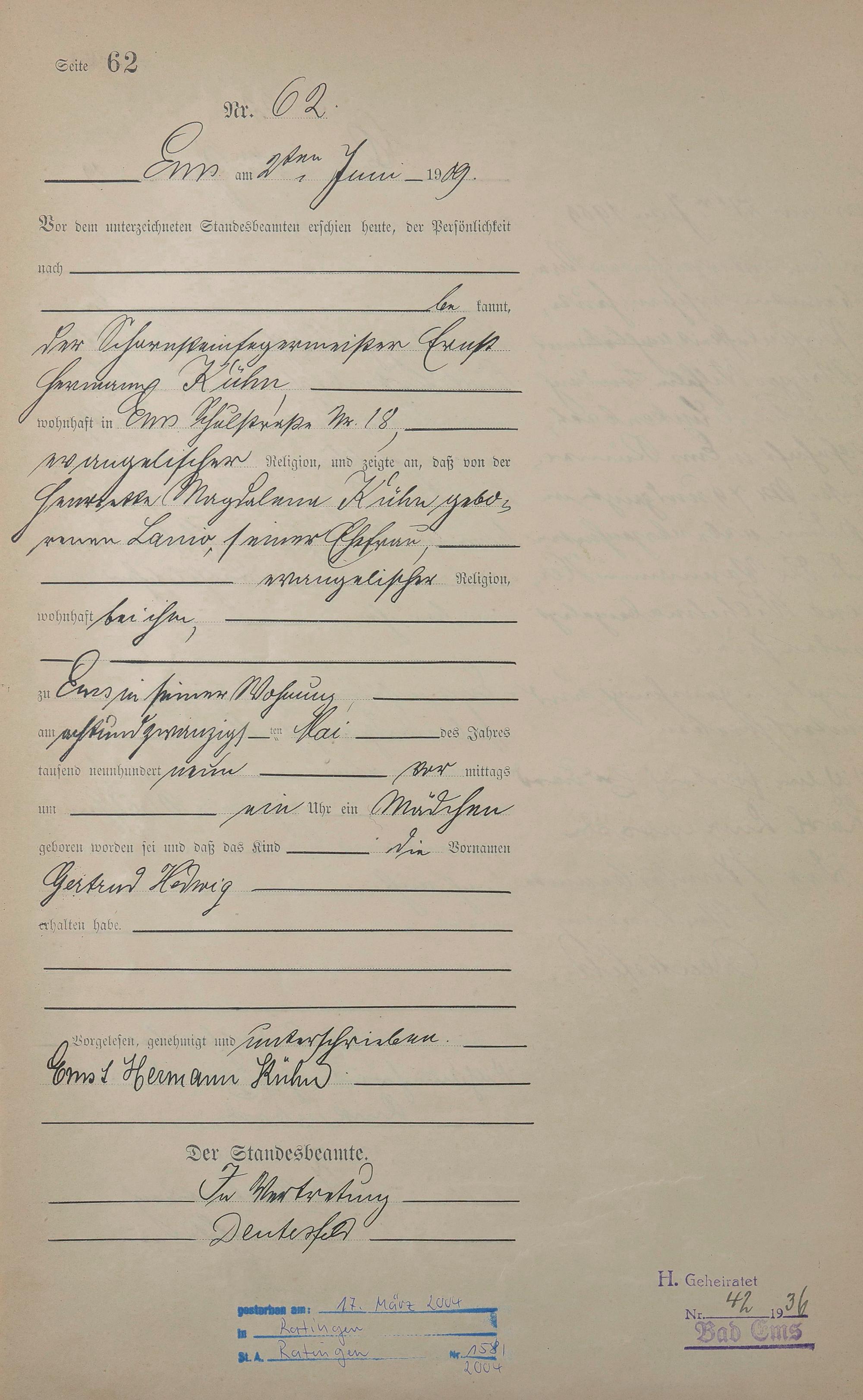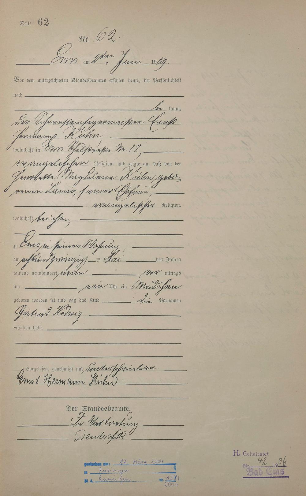 Geburtsregister 1909