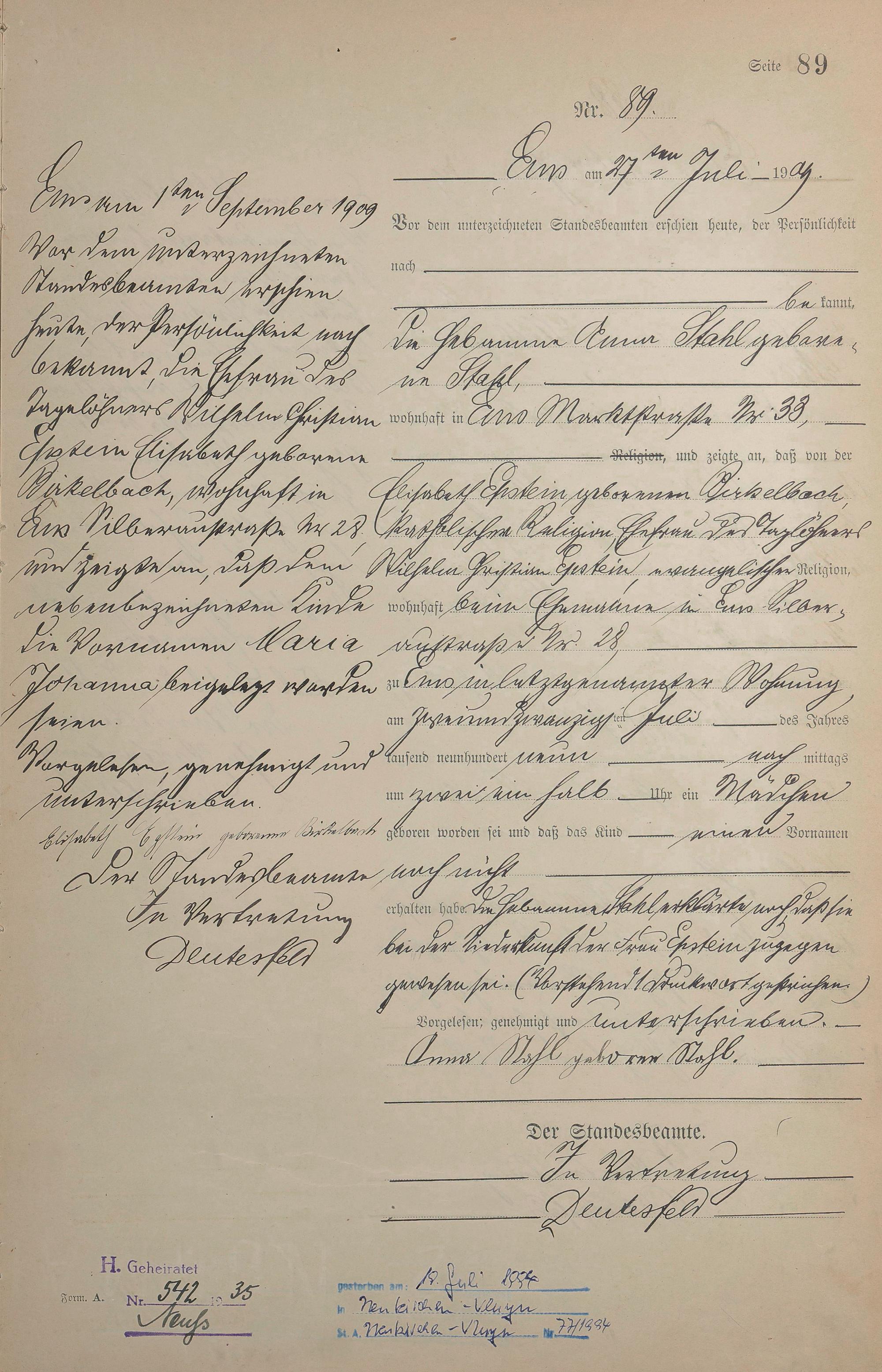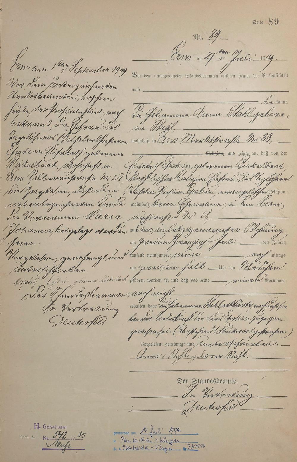 1285: Geburtsregister 1909