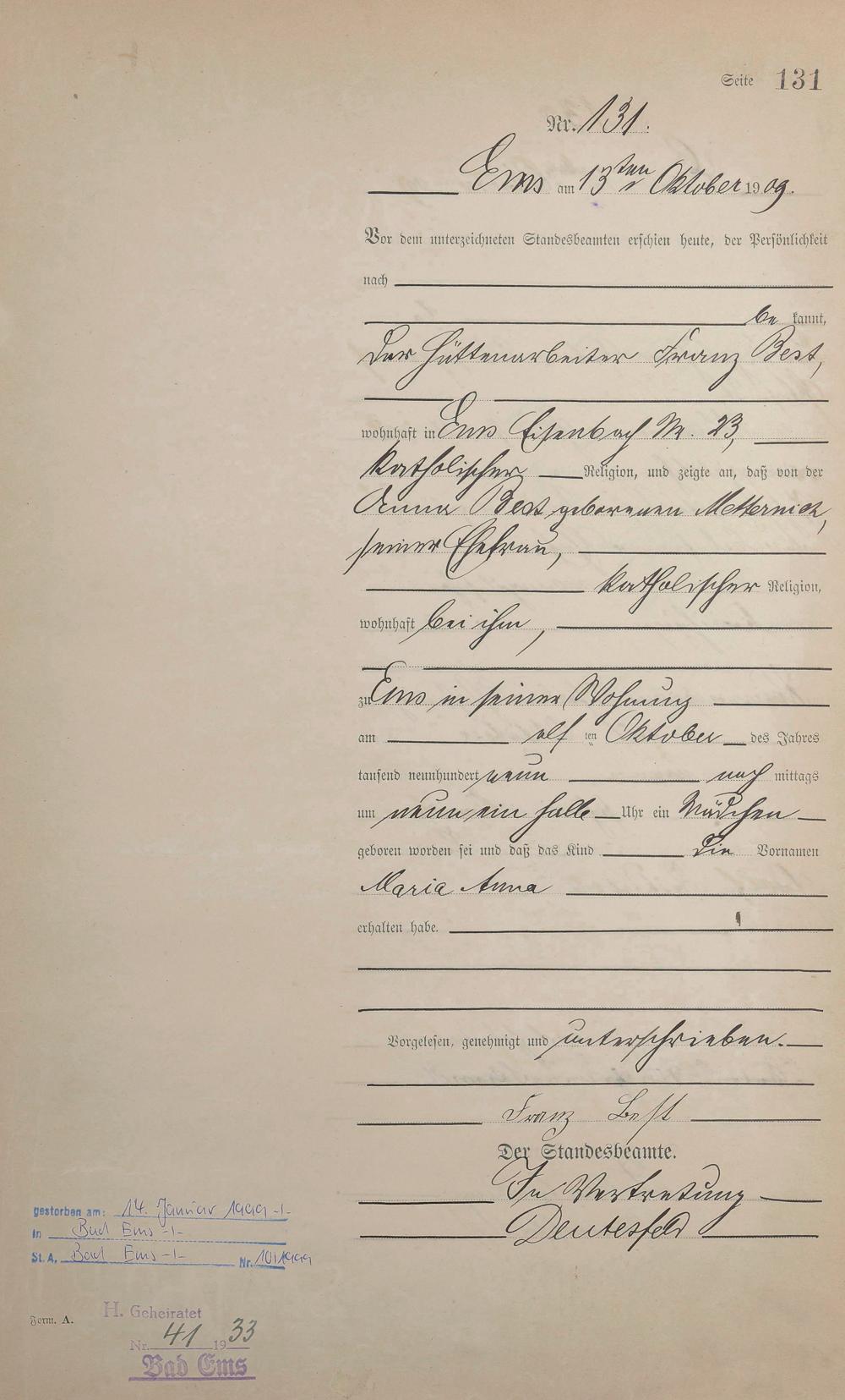Geburtsregister 1909