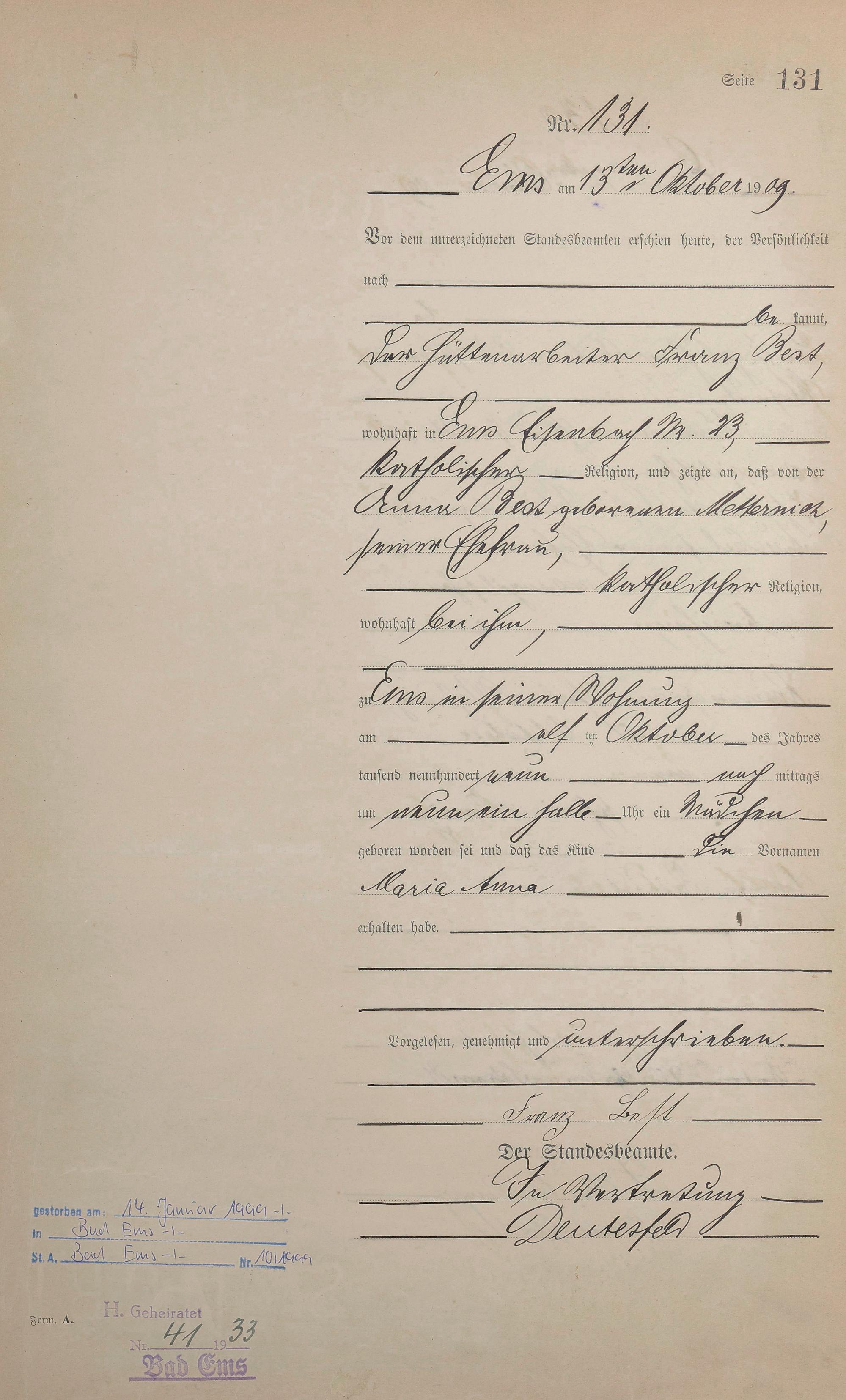 1285: Geburtsregister 1909