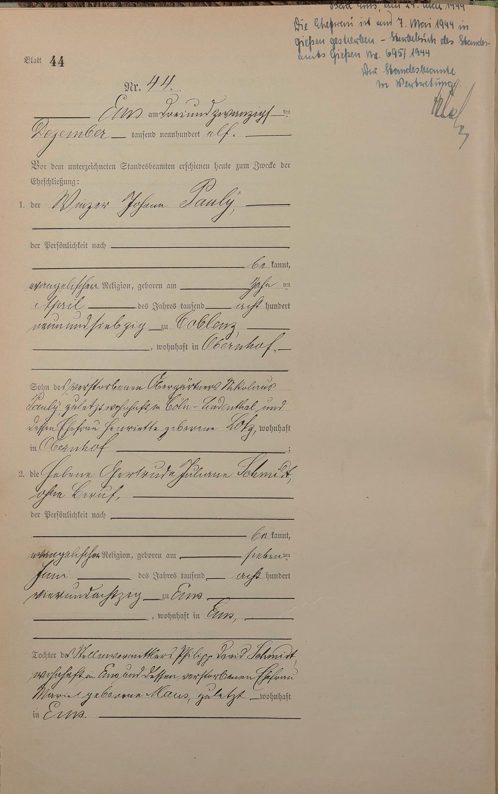 Heiratsregister 1911