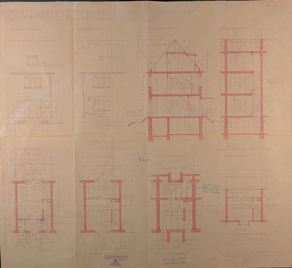 Wohnhaus der Nassauer Heimstätte Wohnungsfürsorgegesellschaft Bad Ems Bleichstraße 49 - 68 Nr. Flur 99 Nr. 54/3, 55/3, 56/3, 57/3, 58/3, 59/3, 60/3, 61/3, 62/3, 63/3, 64/3, 65/3, 66/3, 67/3, 68/3, 69/3, 70/3, 71/3, 72/3 und 73/3 (3) - Ansichten, Schnitte und Grundrisse