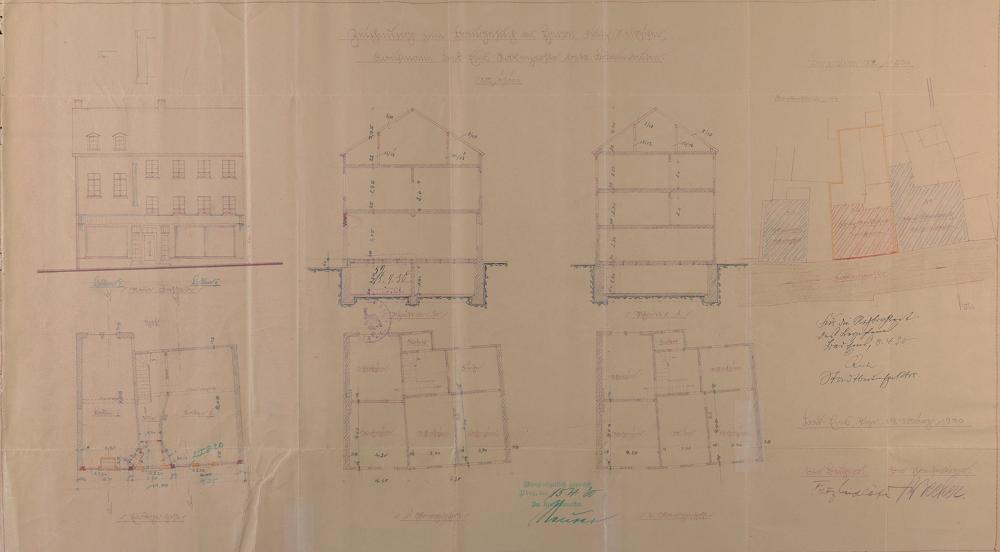 Umbau der Ladens des Friedrich Neidhöfer und Caroline geb. Klopp Bad Ems Bargasse/Koblenzer Straße Nr. 14 (76) Nr. Flur 104 Nr. 32 - Ansicht, Schnitte, Grundrisse und Lageplan