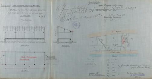 Provisorischer Schuppen des Adolf Scherrer Bad Ems Am Ranzenstein Nr. 2 und 3 Flur Nr. 8/7 und 8/8 (204/86, 144/87, 151/87, 152/92, 130/93, 104) - Schnitte, Grundriss und Lageplan