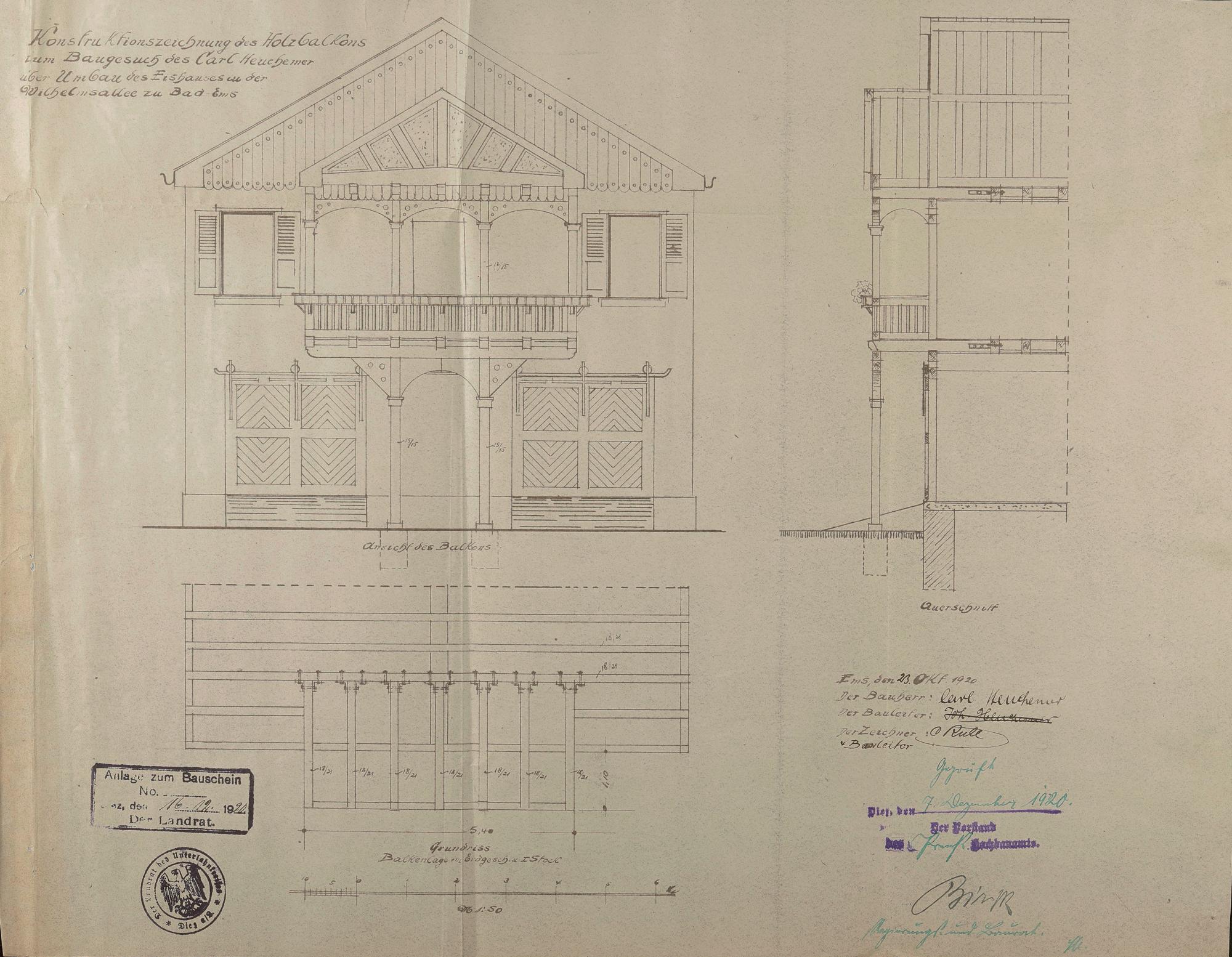 Umbau des Eishauses des Rudolf Eisfeller/Carl Heuchemer/Lahnsäge- und Hobelwerk der Firma Heuchohl GmbH Mainz Bad Ems Wilhelmsallee Nr. 55 Flur 95 Nr. 3/9 (3, 4, 84/2, 5 und 6) - Ansicht, Schnitt und Grundriss Balkon