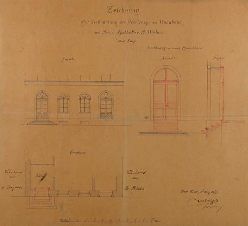 Freitreppe an der Apotheke am Kursaal des August Weber und Antoinette geb. Schöler/Dr. Julius Crone/Dr. Hans Dadder und Adele Wilhelmine geb. Kothes Bad Ems Römerstraße Nr. 10 Flur 91 Nr. 6/3 (6) - Ansichten, Schnitt und Grundriss