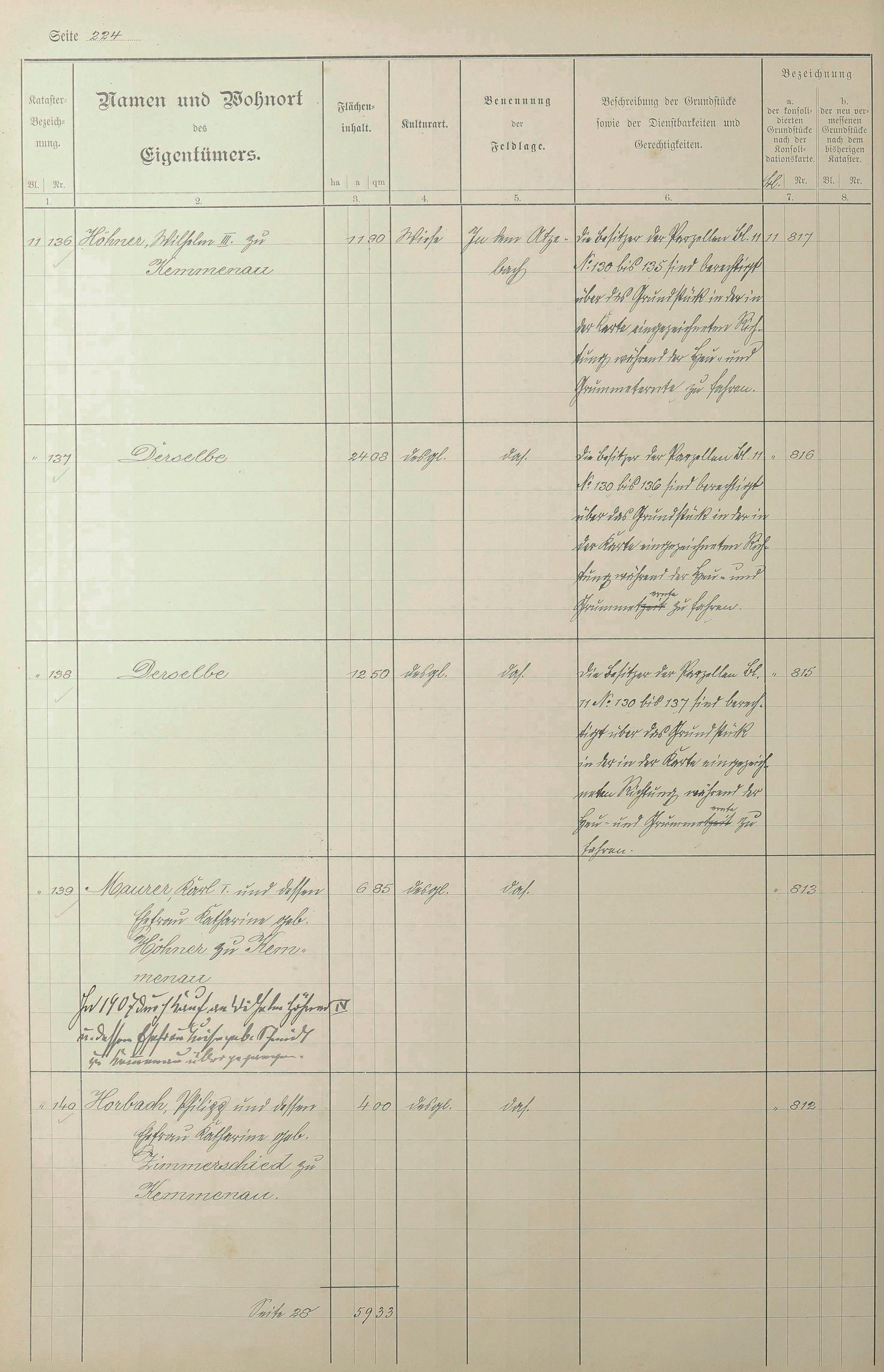 Lagerbuch der konsolidierten Gemarkung Kemmenau von dem Königlichen Kommissar für die Güterkonsolidation Regierungsrat Schiffler und Vermessungsbeamten Steinbichler