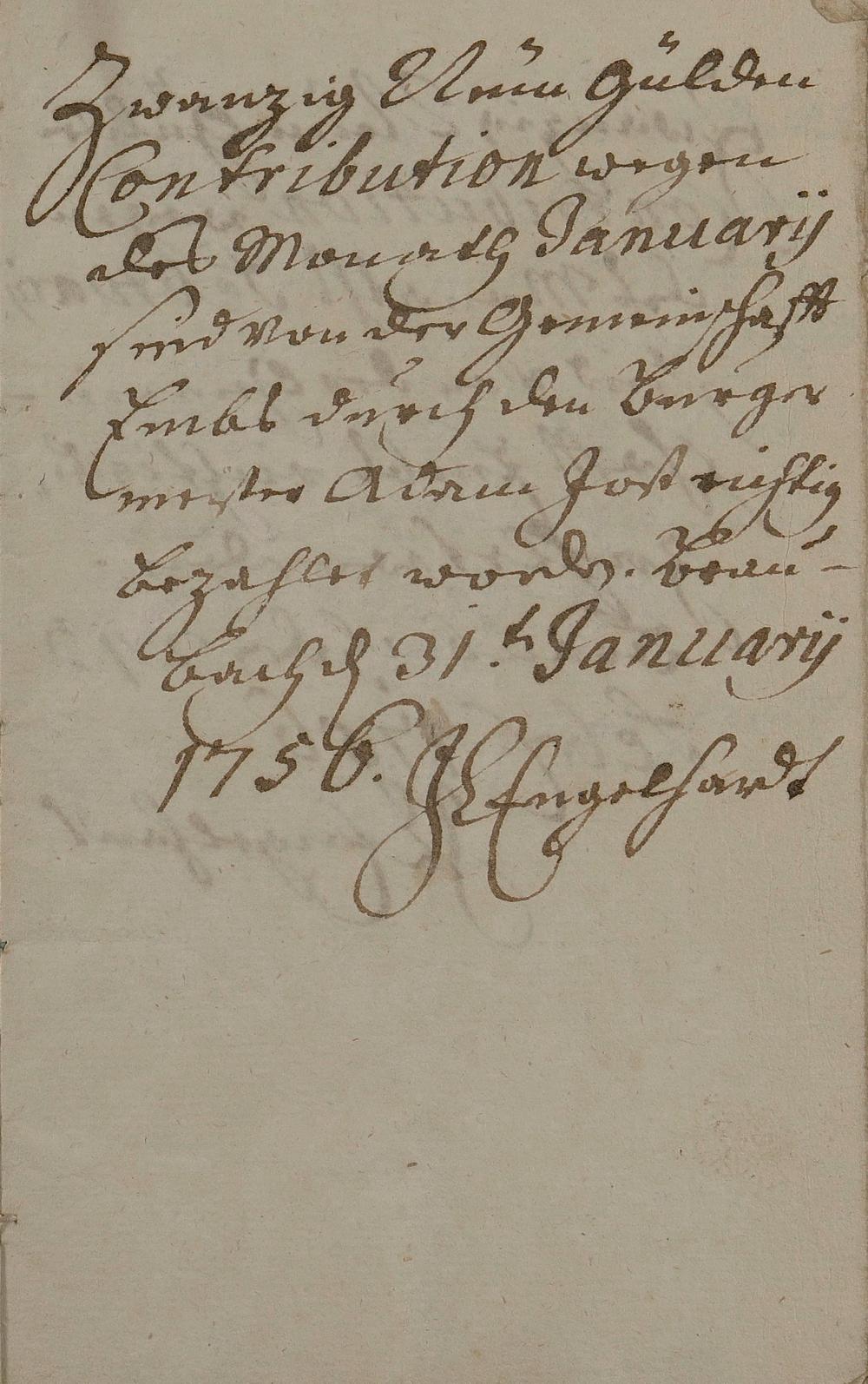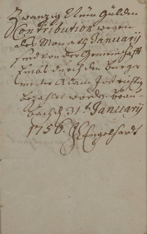 Quittungsbücher des Amtes Braubach über die monatlich bezahlte Kontribution 1756, 1757, 1760 und 1761 in Höhe von 29 Gulden durch den Amtmann? J. C. Engelhardt
