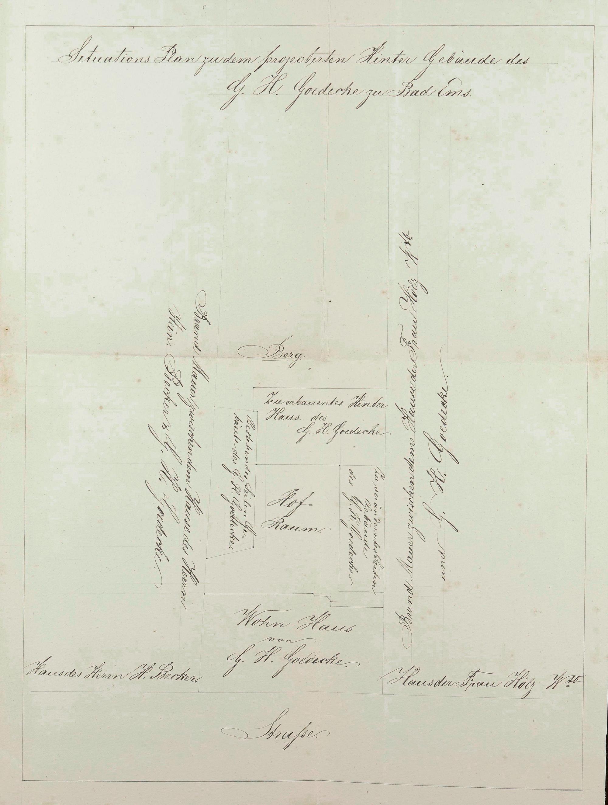 Hintergebäude des Hauses "Sächsischer Hof"/"Burg Nassau"/"Hotel Bristol"/"Haus Nassau" des Georg Heinrich Gödecke und Therese geb. Conrad/Hermann Sadony und Karoline geb. Guntermann/Dr. Fritz Doepner/Bad Ems Römerstraße Nr 45 Flur 92 Nr. 78/23
