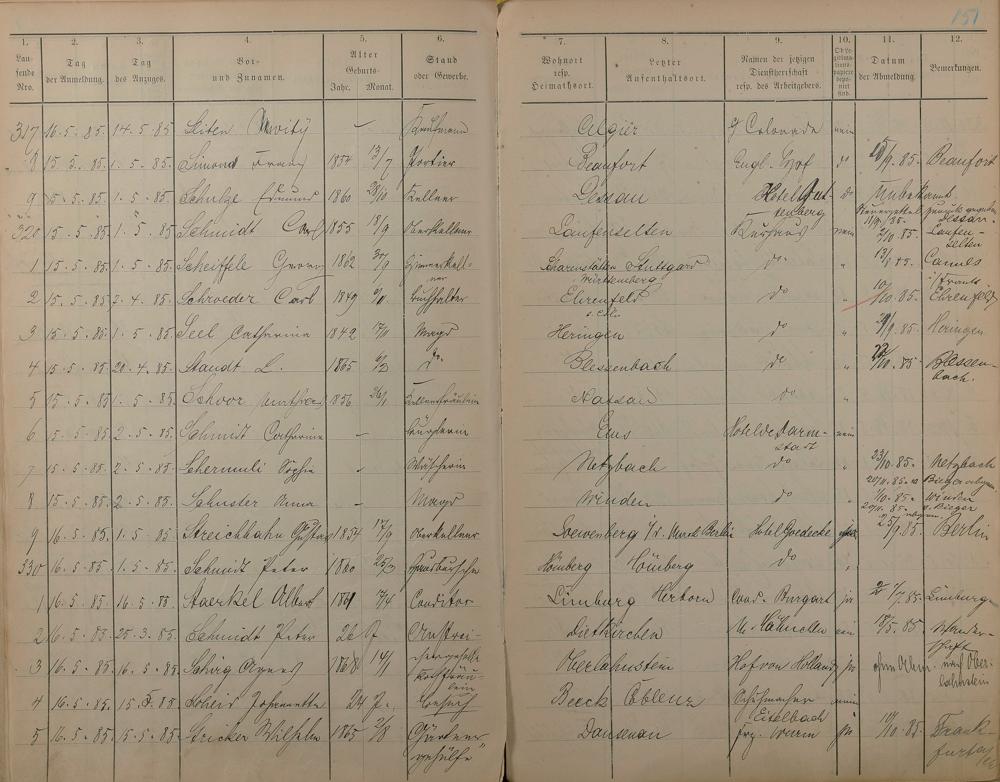 Melderegister der Gewerbegehilfen, Gesellen und Dienstboten 1884 - 1886