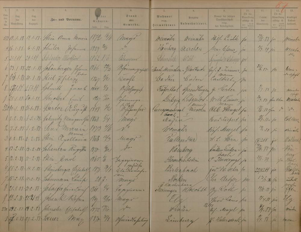Melderegister der Gewerbegehilfen, Gesellen und Dienstboten 1886 - 1889