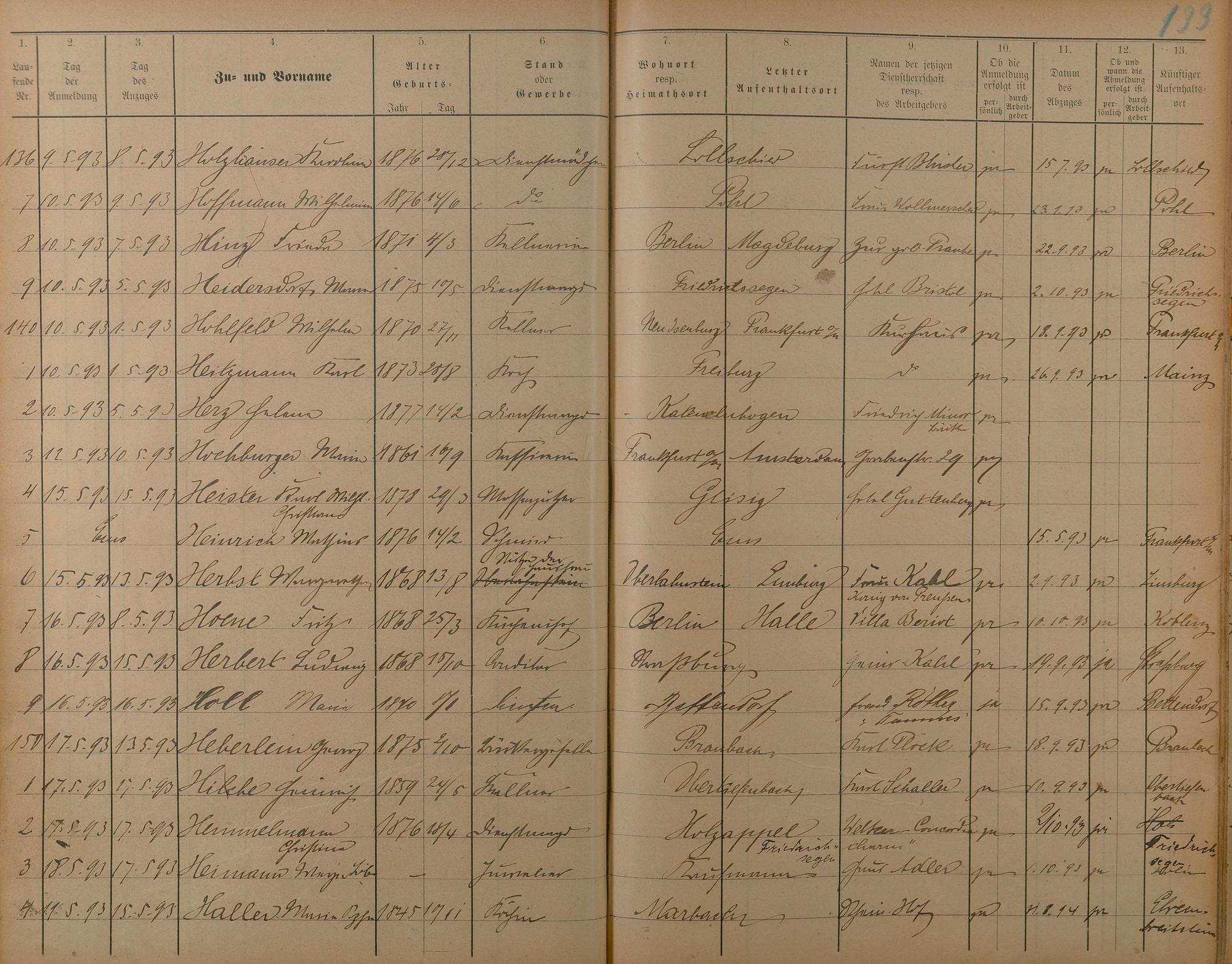 Melderegister der Gewerbegehilfen, Gesellen und Dienstboten 1892 - 1895