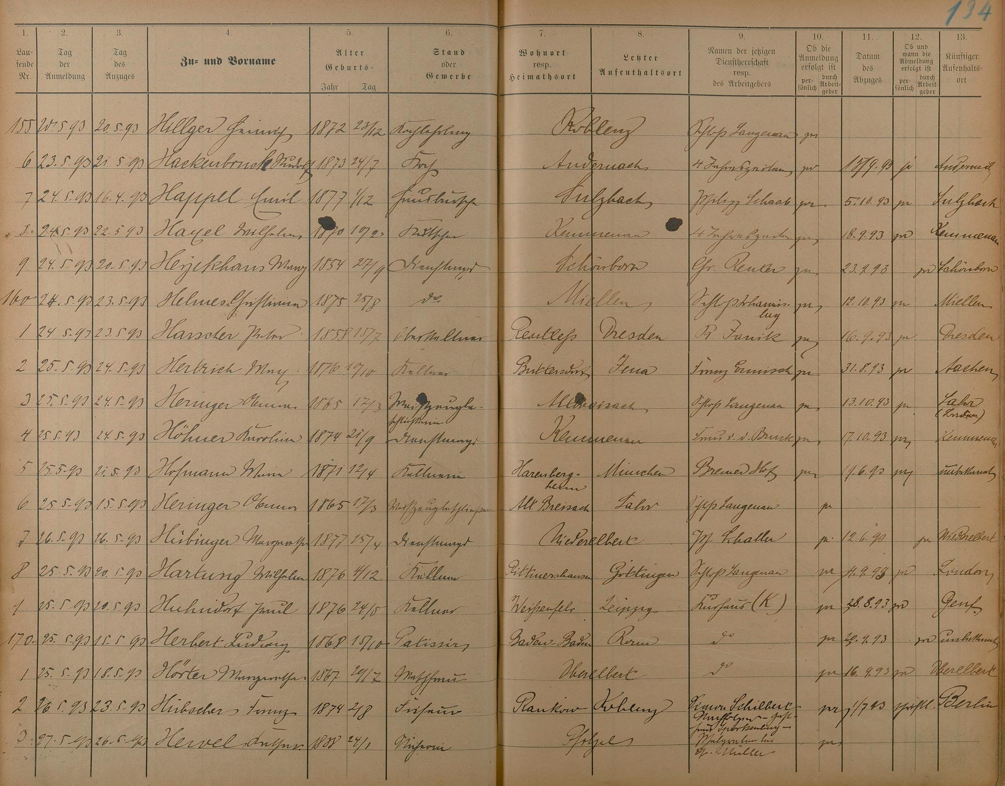 Melderegister der Gewerbegehilfen, Gesellen und Dienstboten 1892 - 1895