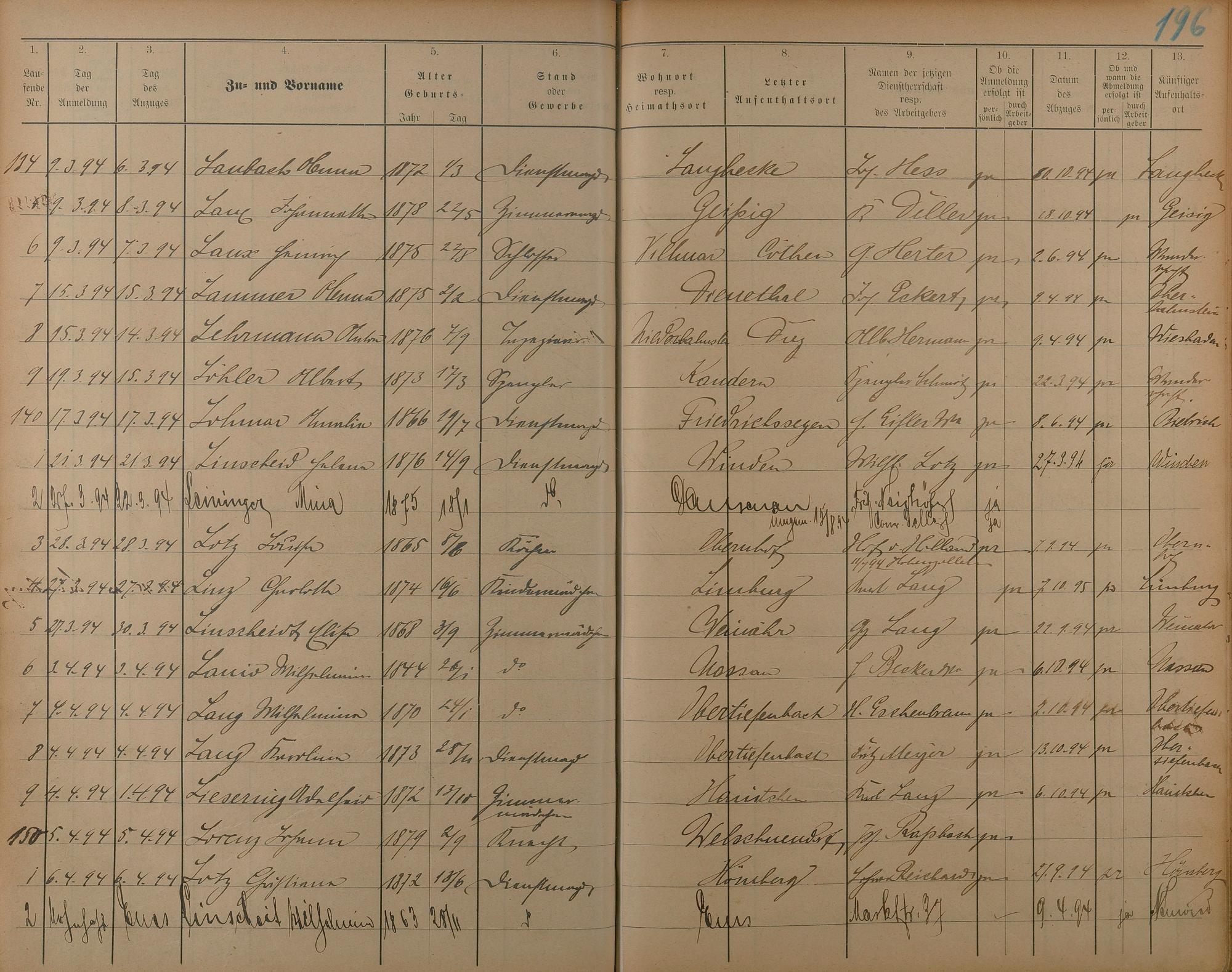 Melderegister der Gewerbegehilfen, Gesellen und Dienstboten 1892 - 1895