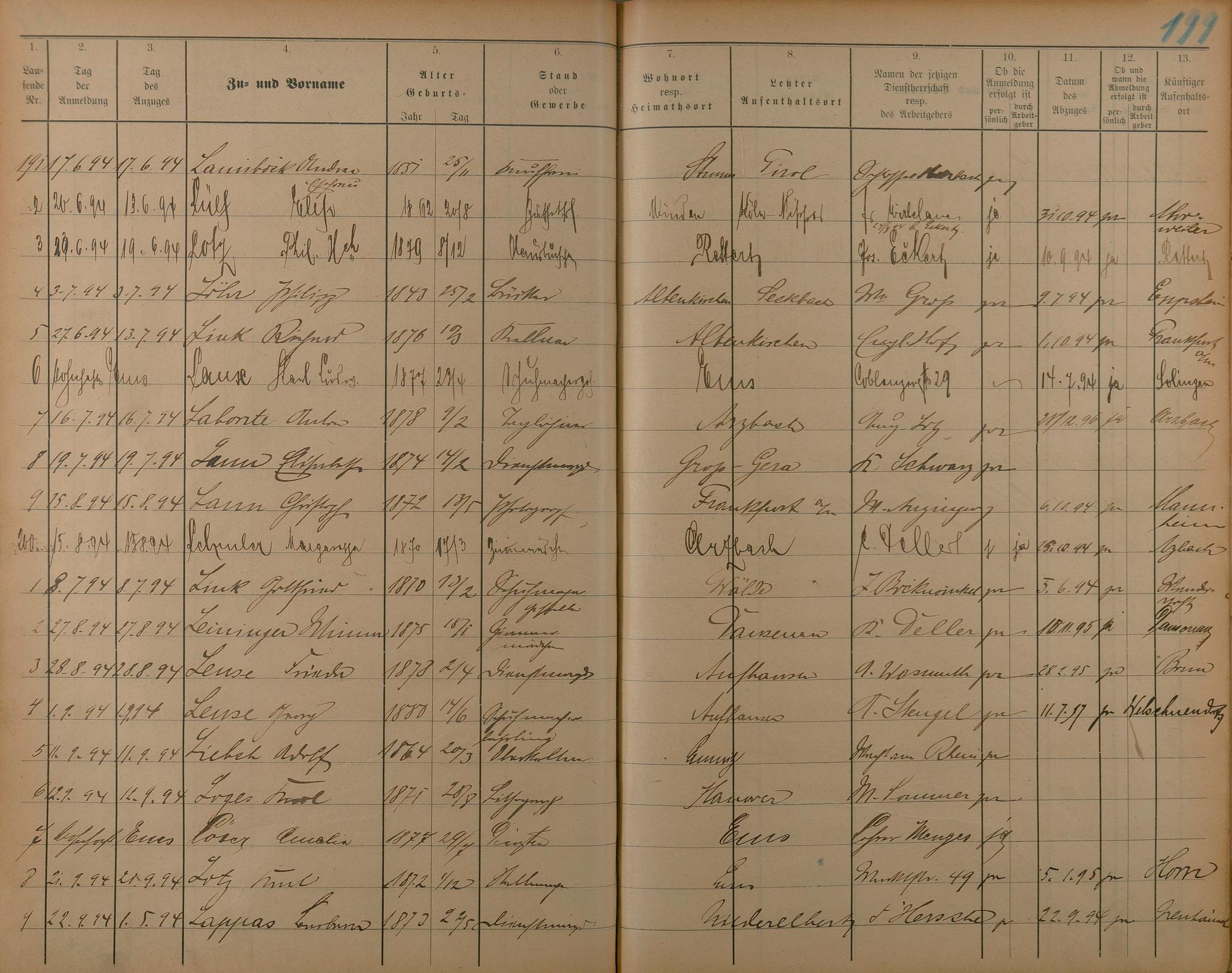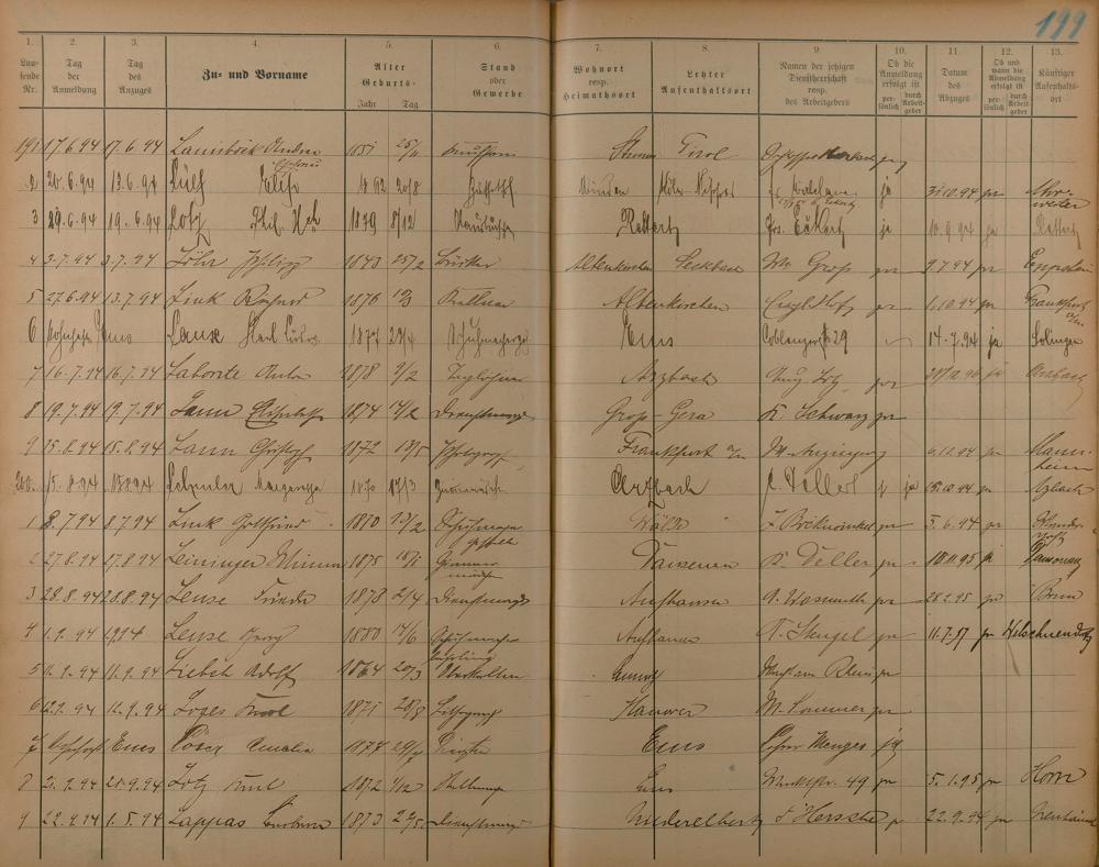 Melderegister der Gewerbegehilfen, Gesellen und Dienstboten 1892 - 1895