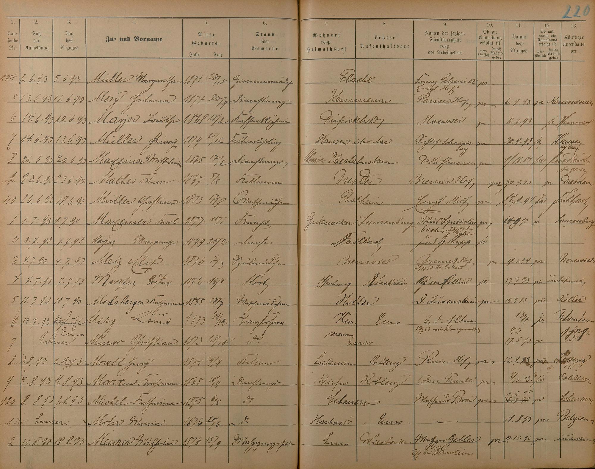 Melderegister der Gewerbegehilfen, Gesellen und Dienstboten 1892 - 1895