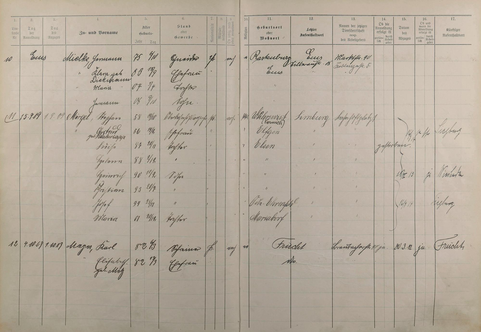 Melderegister 1909 - 1914