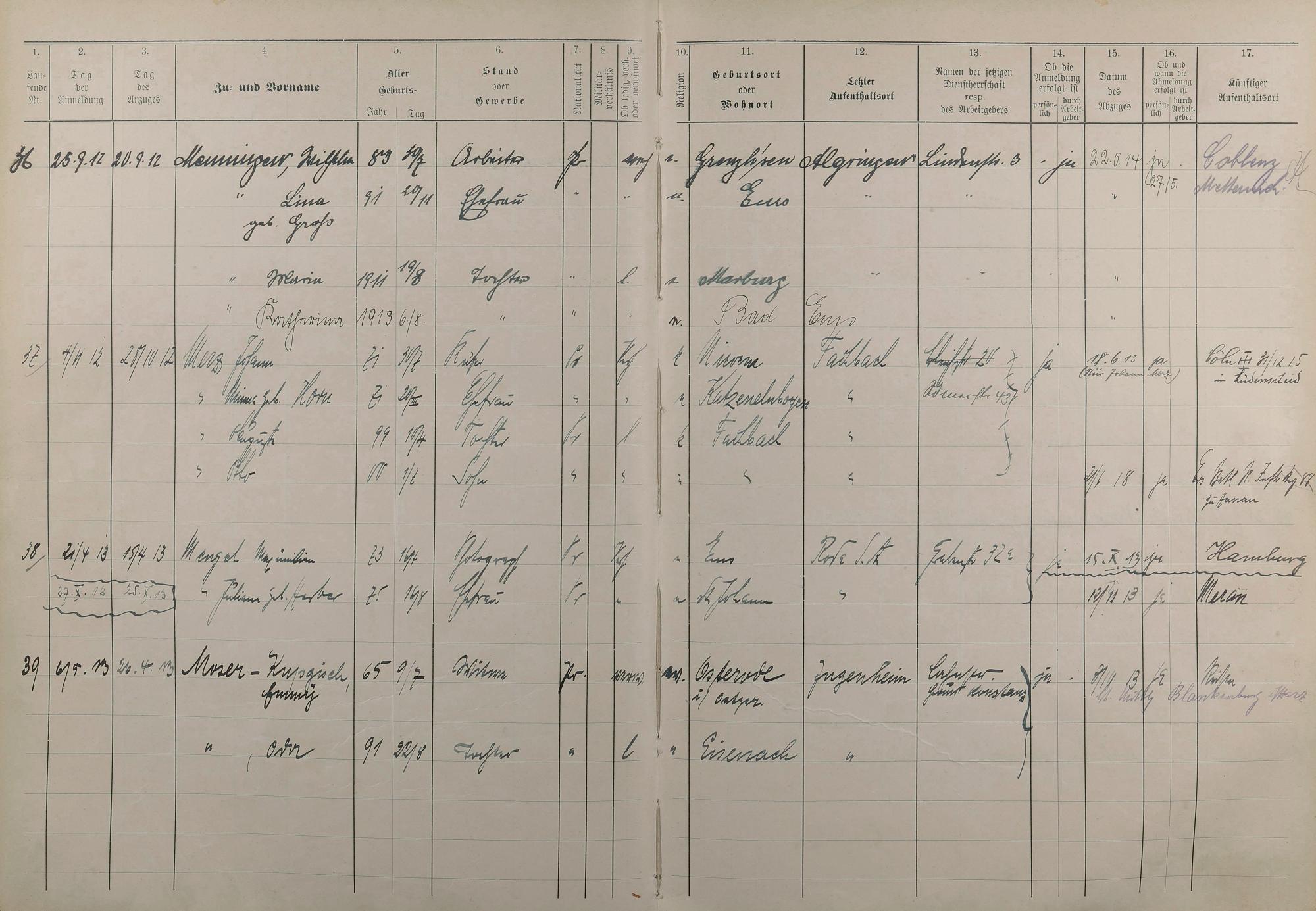 Melderegister 1909 - 1914