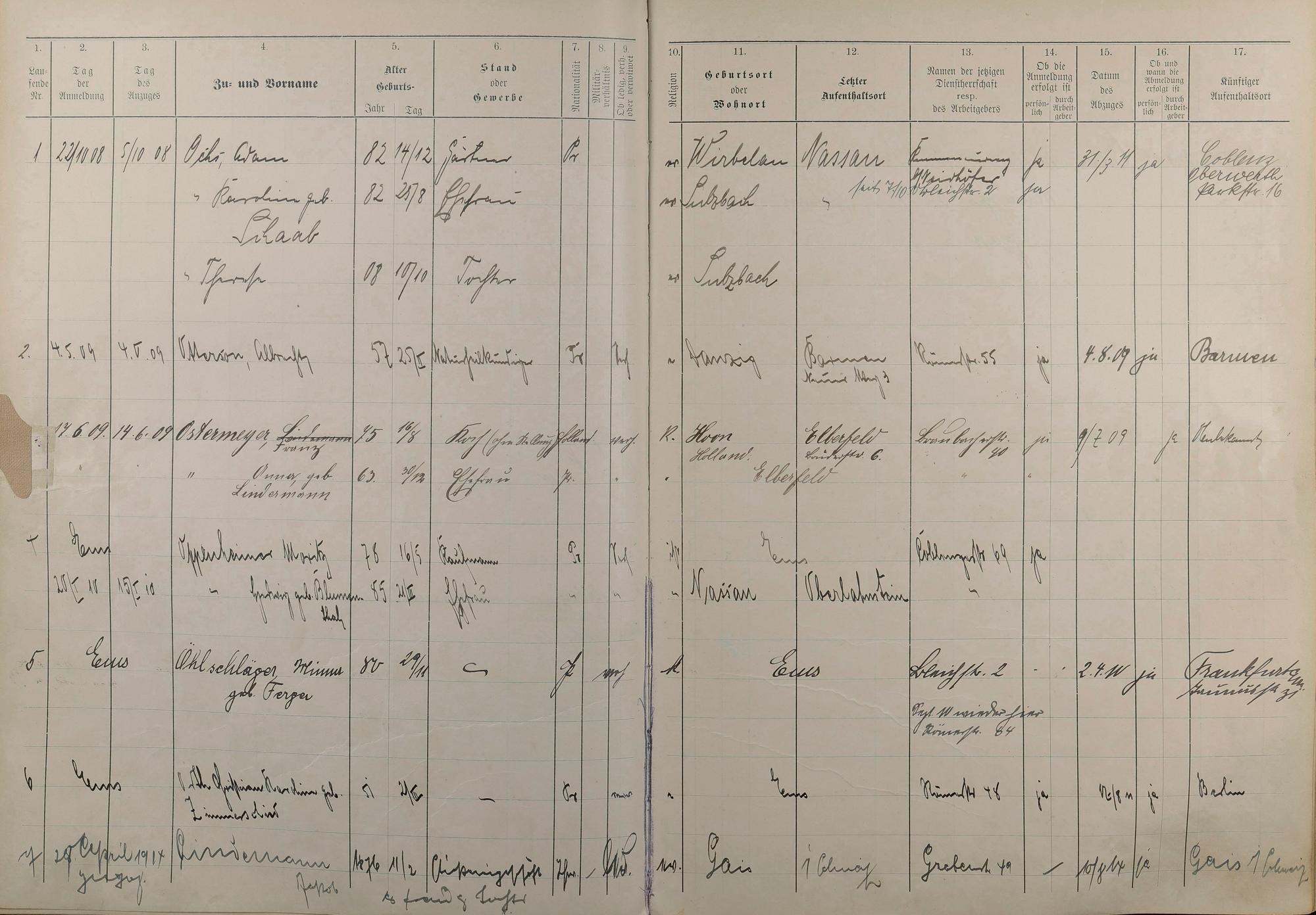 Melderegister 1909 - 1914