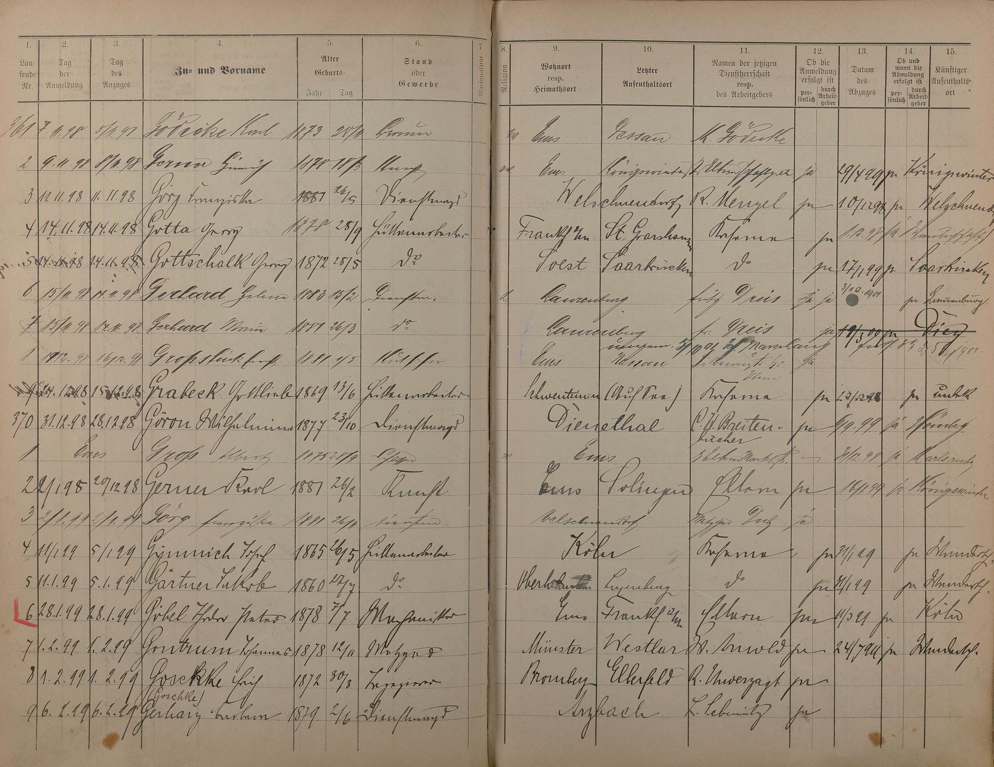 Melderegister der Gewerbegehilfen, Gesellen und Dienstboten 1895 - 1899