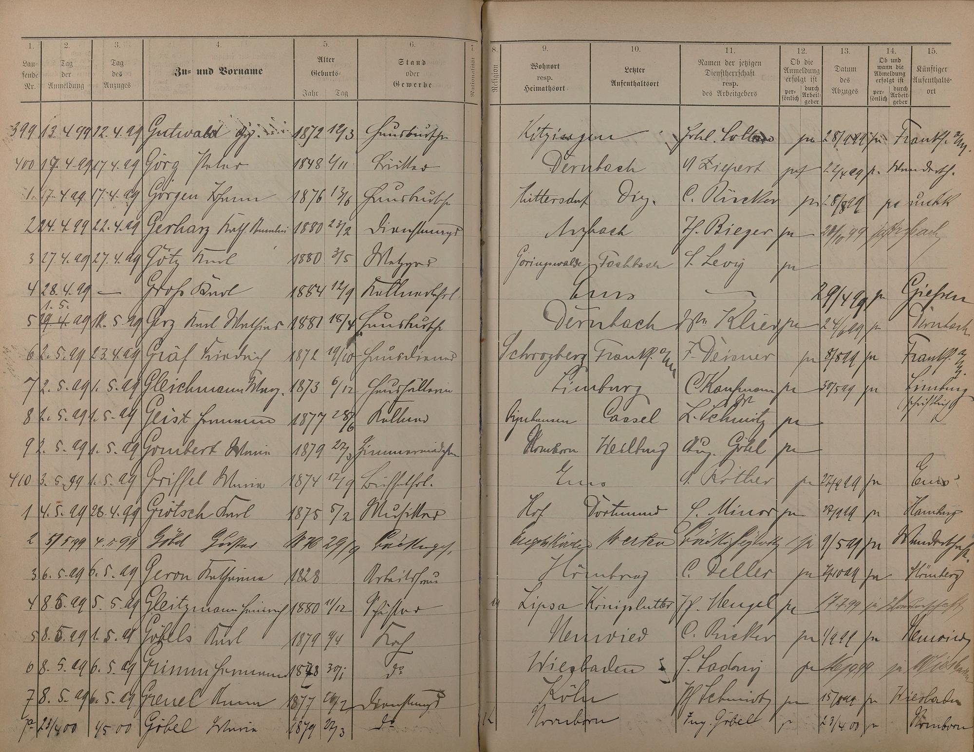 Melderegister der Gewerbegehilfen, Gesellen und Dienstboten 1895 - 1899