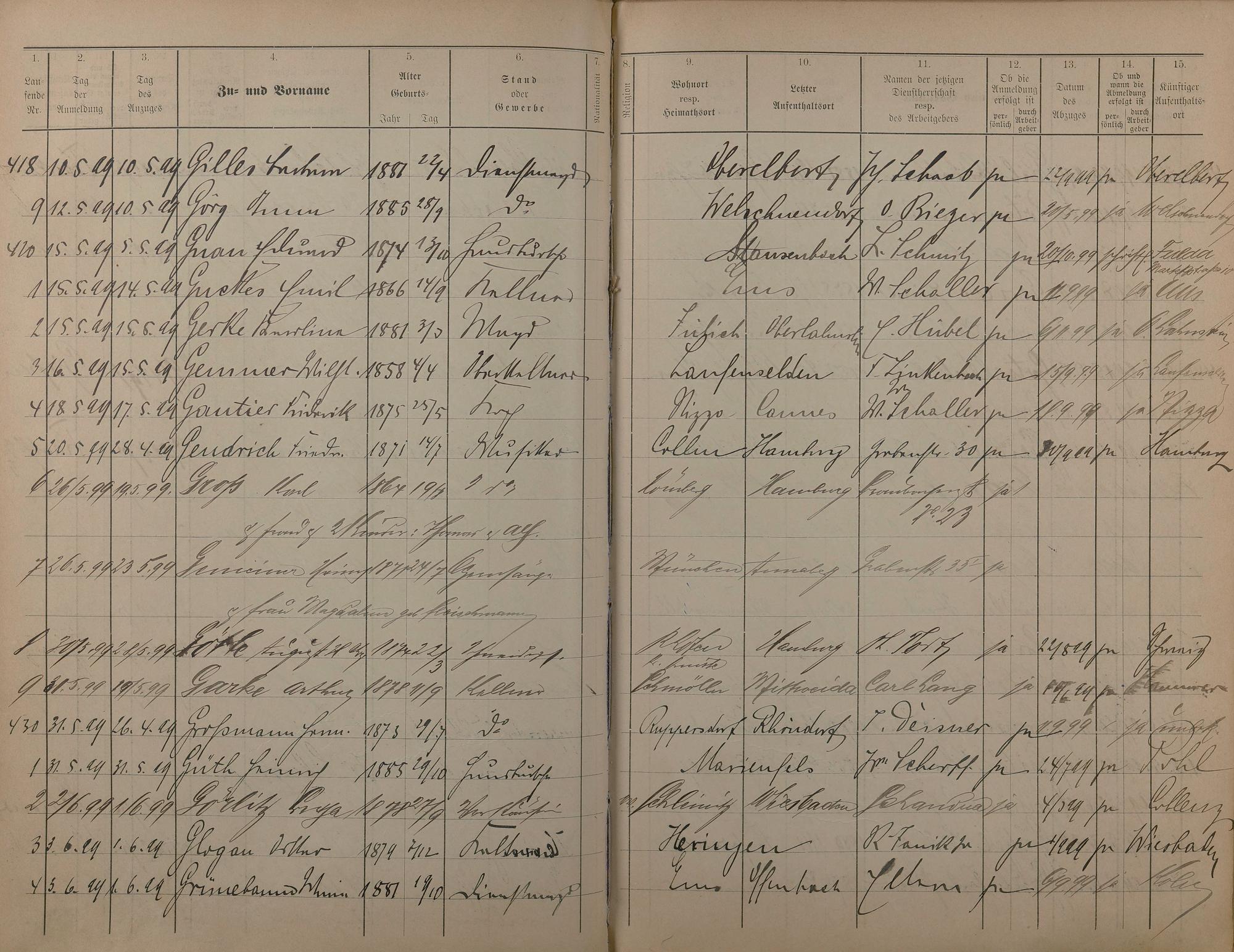 Melderegister der Gewerbegehilfen, Gesellen und Dienstboten 1895 - 1899