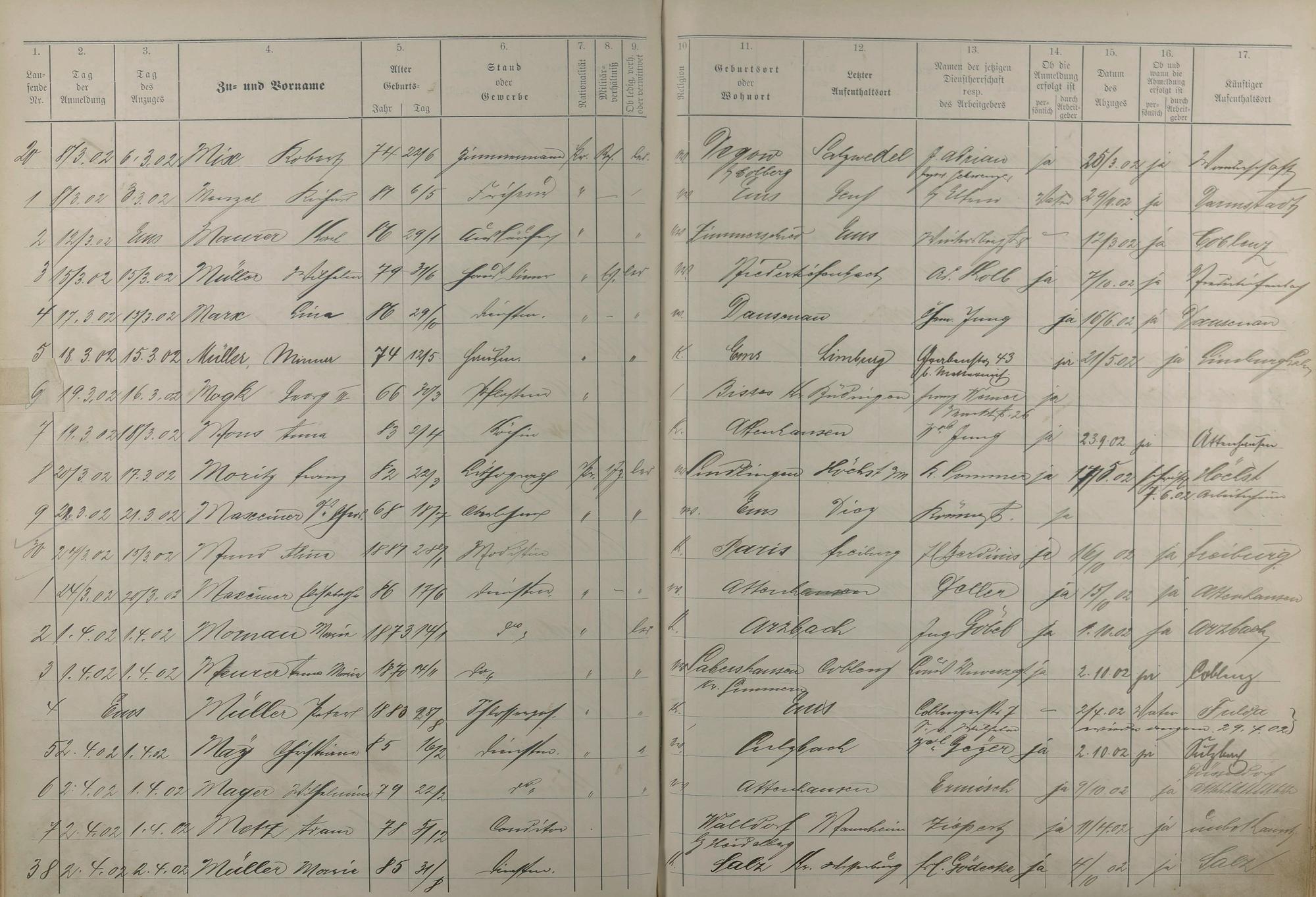 Melderegister der Gewerbegehilfen, Gesellen und Dienstboten 1902 - 1903