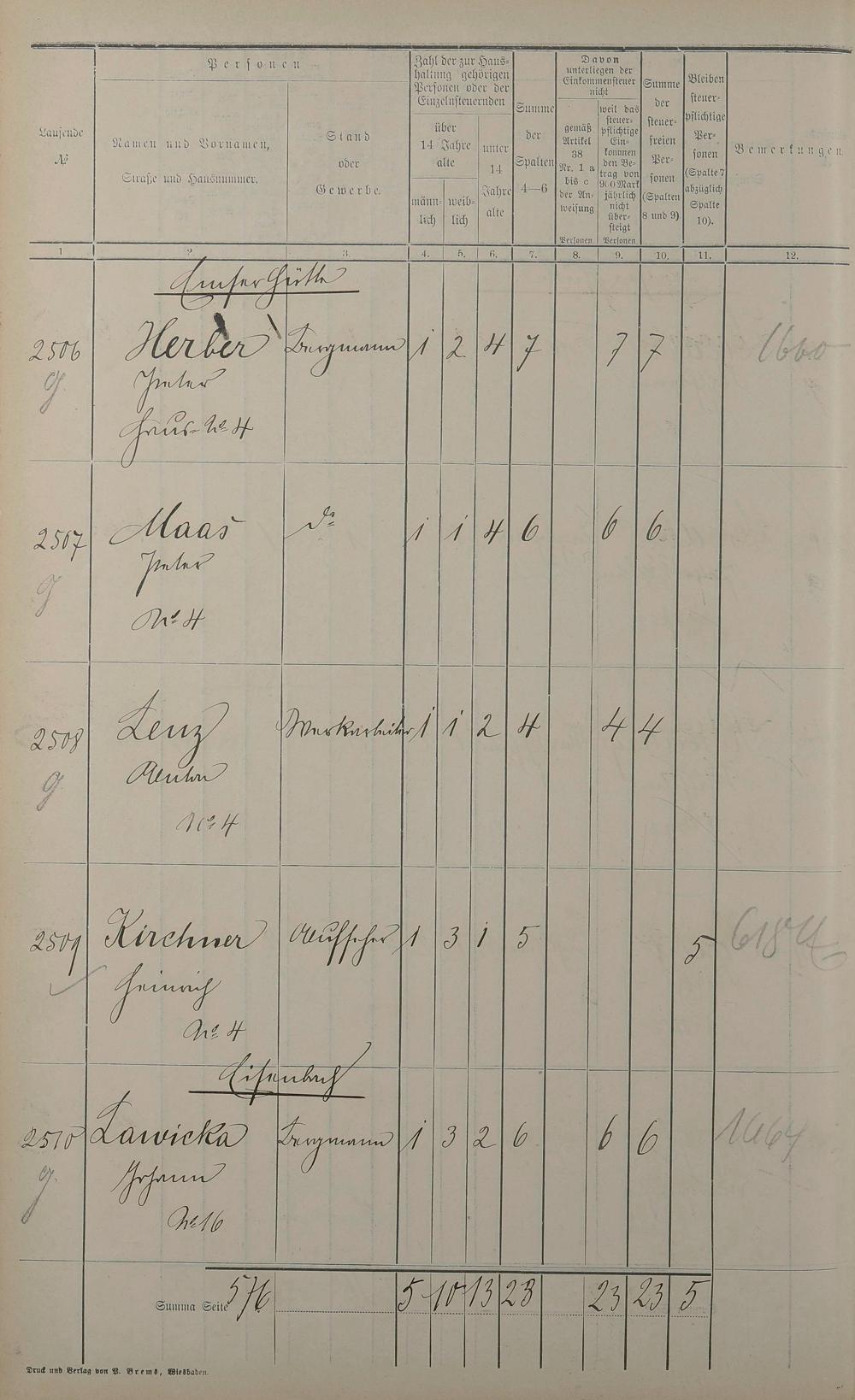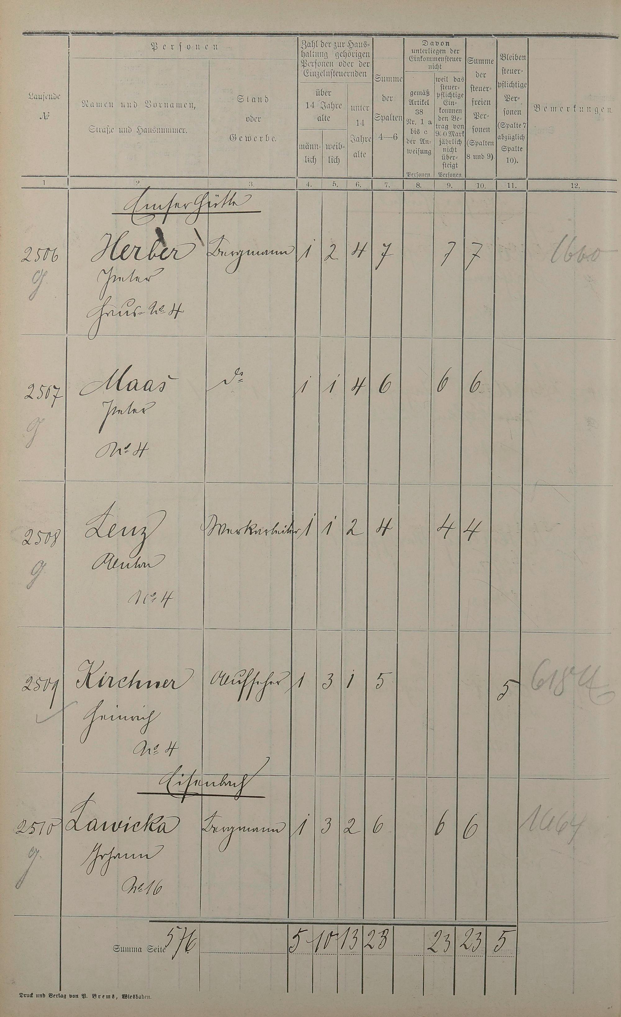 Einwohnerverzeichnis nach Straßen und Anzahl der steuerpflichtigen Personen