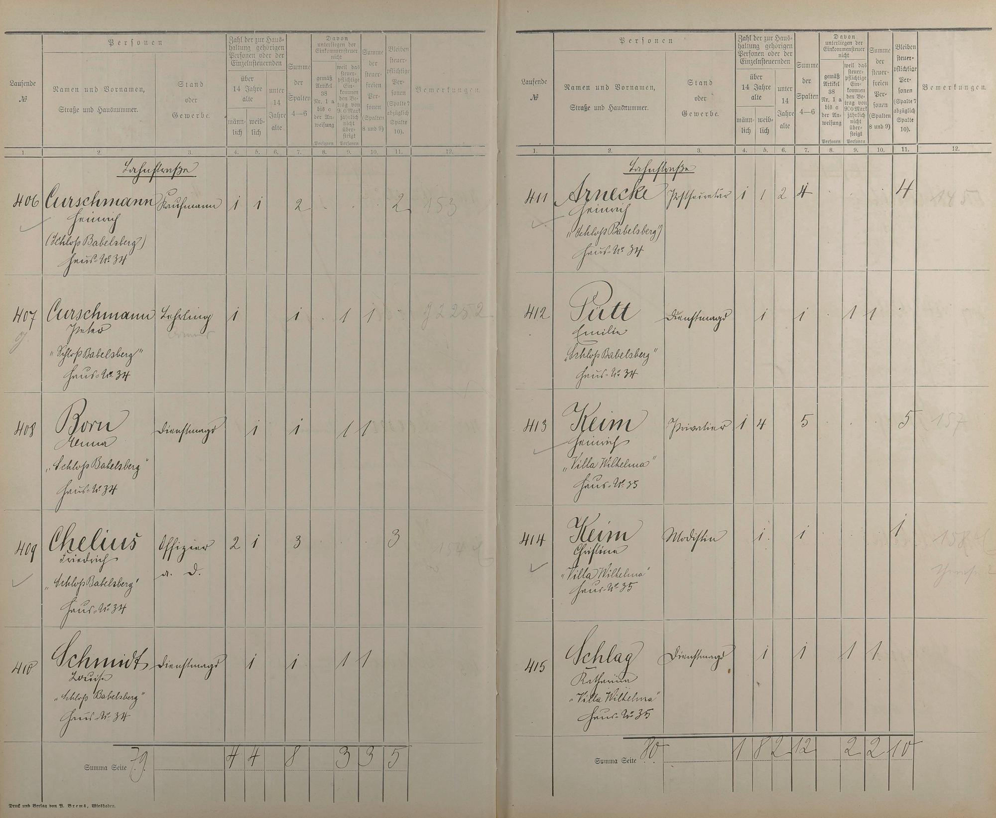 Einwohnerverzeichnis nach Straßen und Anzahl der steuerpflichtigen Personen