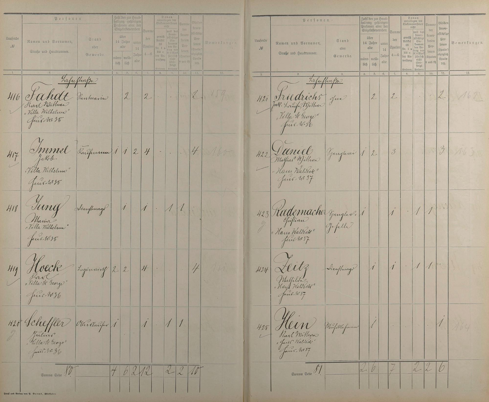 Einwohnerverzeichnis nach Straßen und Anzahl der steuerpflichtigen Personen