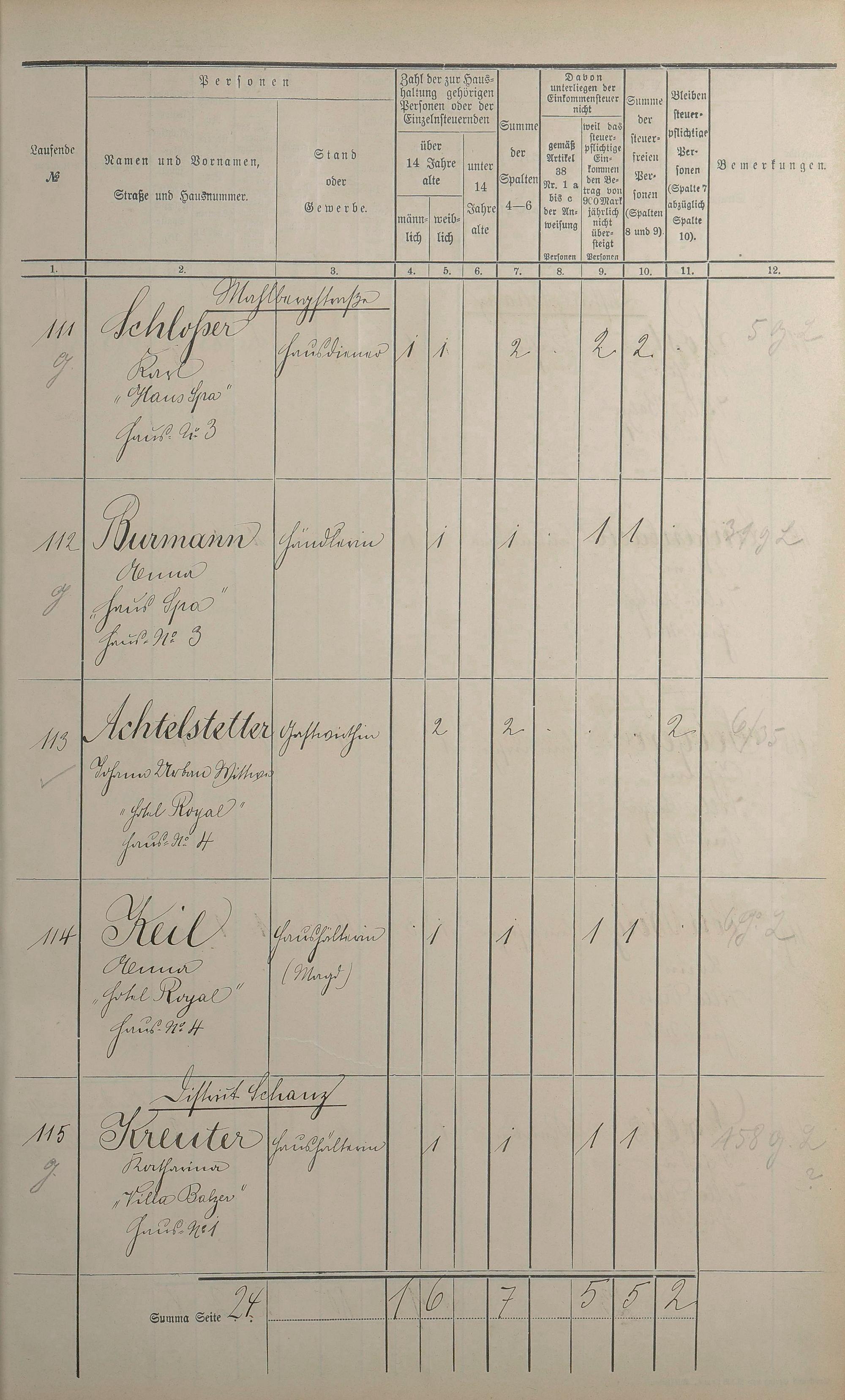 Einwohnerverzeichnis nach Straßen und Anzahl der steuerpflichtigen Personen