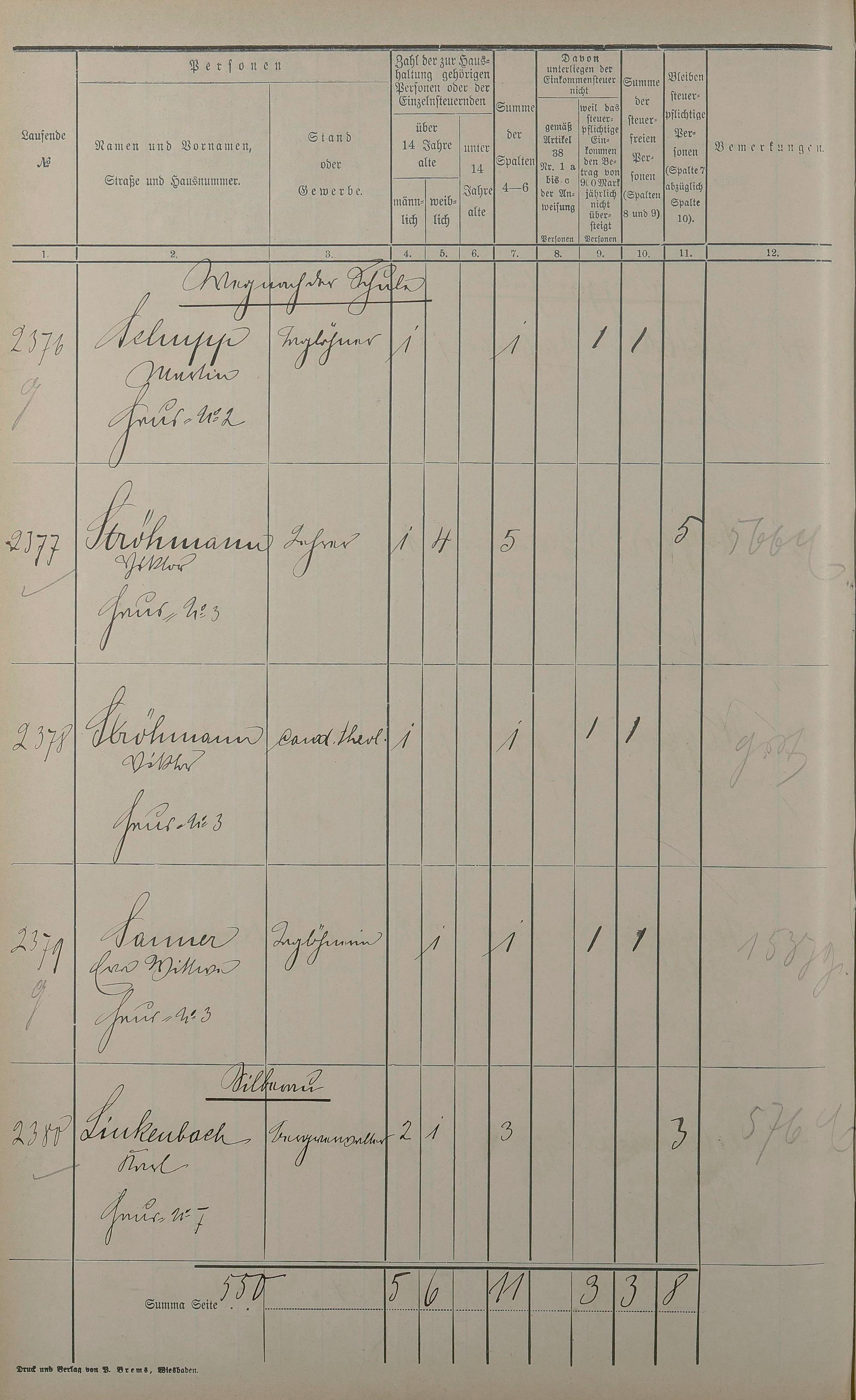 Einwohnerverzeichnis nach Straßen und Anzahl der steuerpflichtigen Personen