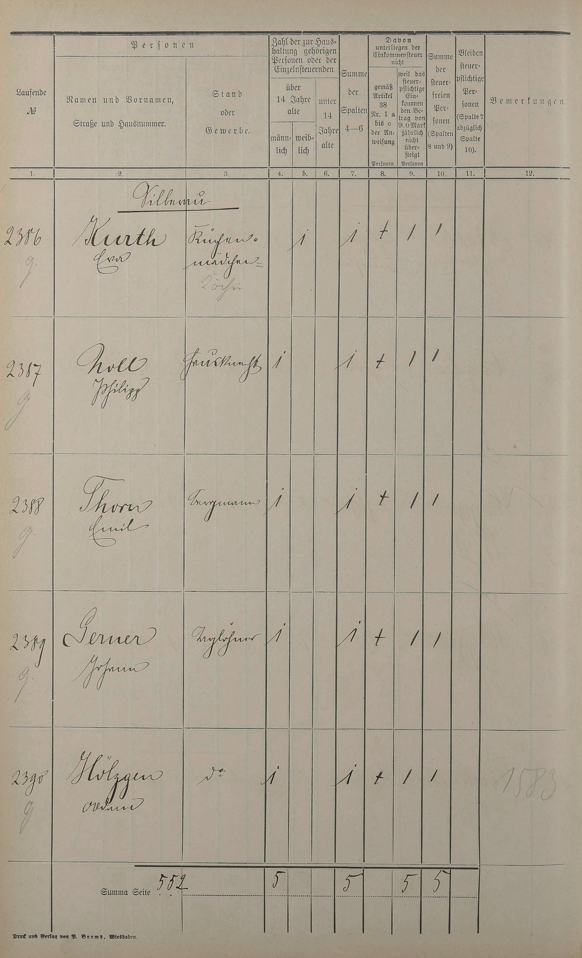 219: Einwohnerverzeichnis nach Straßen und Anzahl der steuerpflichtigen Personen