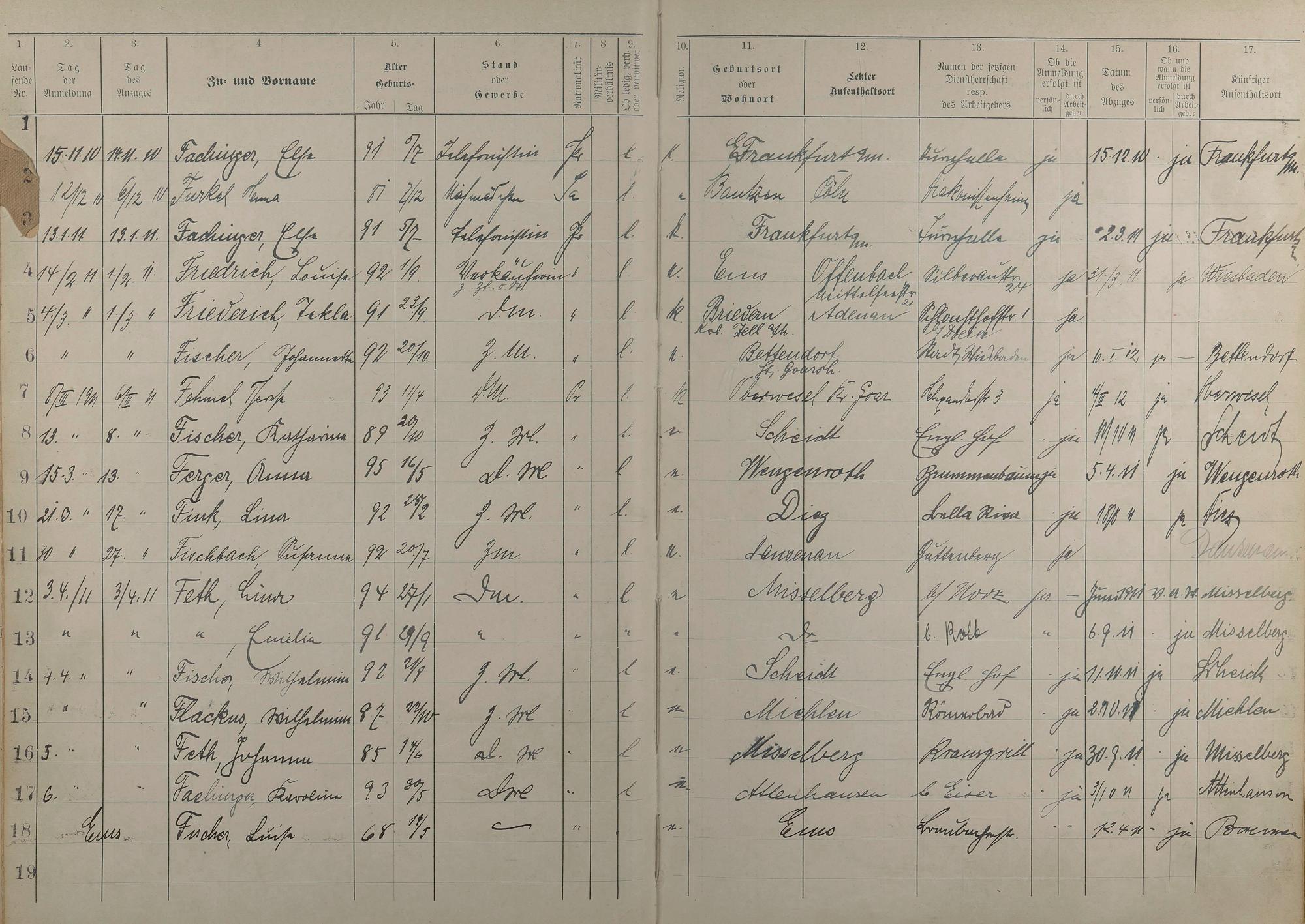 Melderegister der Gewerbegehilfinnen, Gesellinnen und Dienstbotinnen 1911 - Apr. 1915