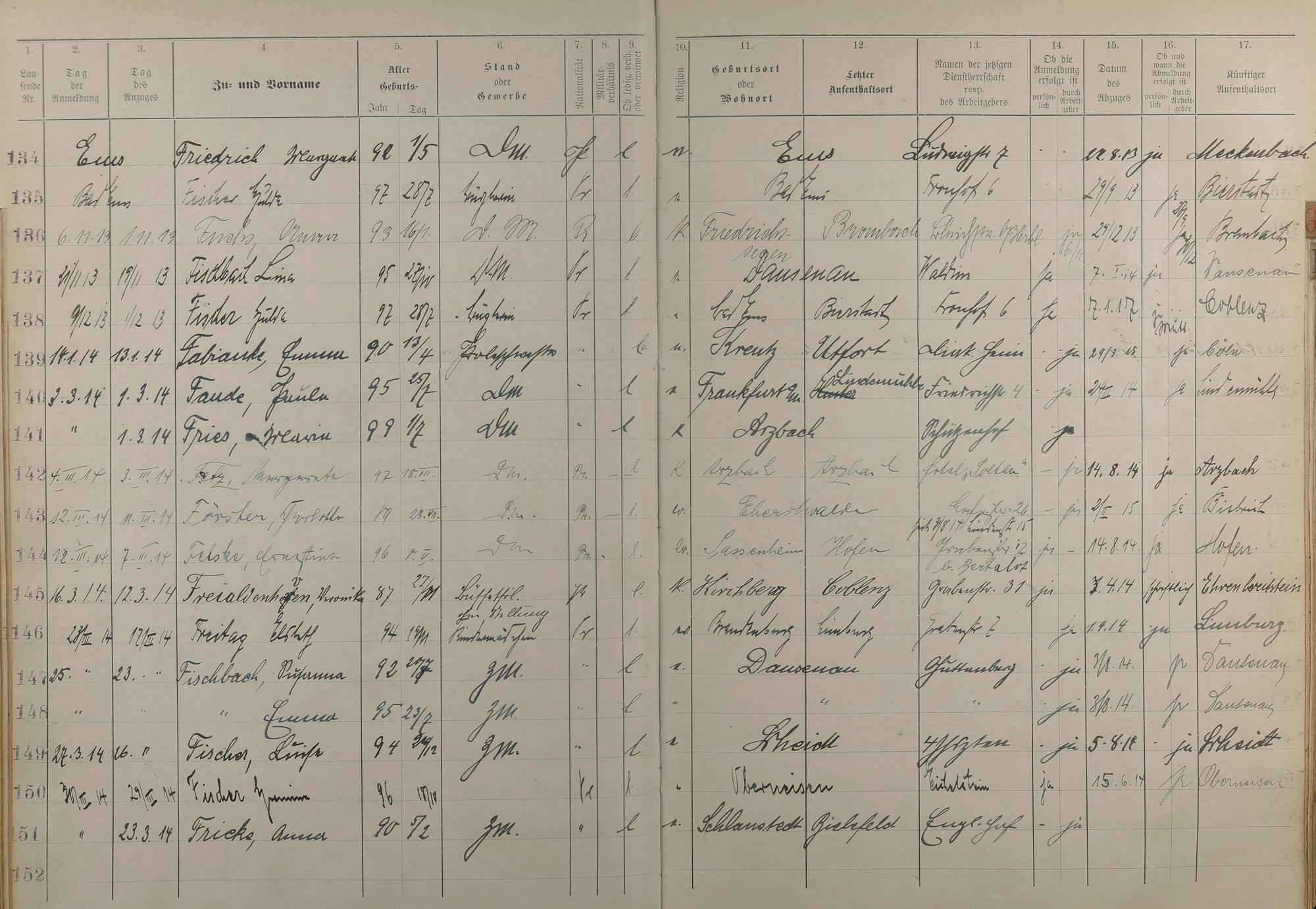 Melderegister der Gewerbegehilfinnen, Gesellinnen und Dienstbotinnen 1911 - Apr. 1915