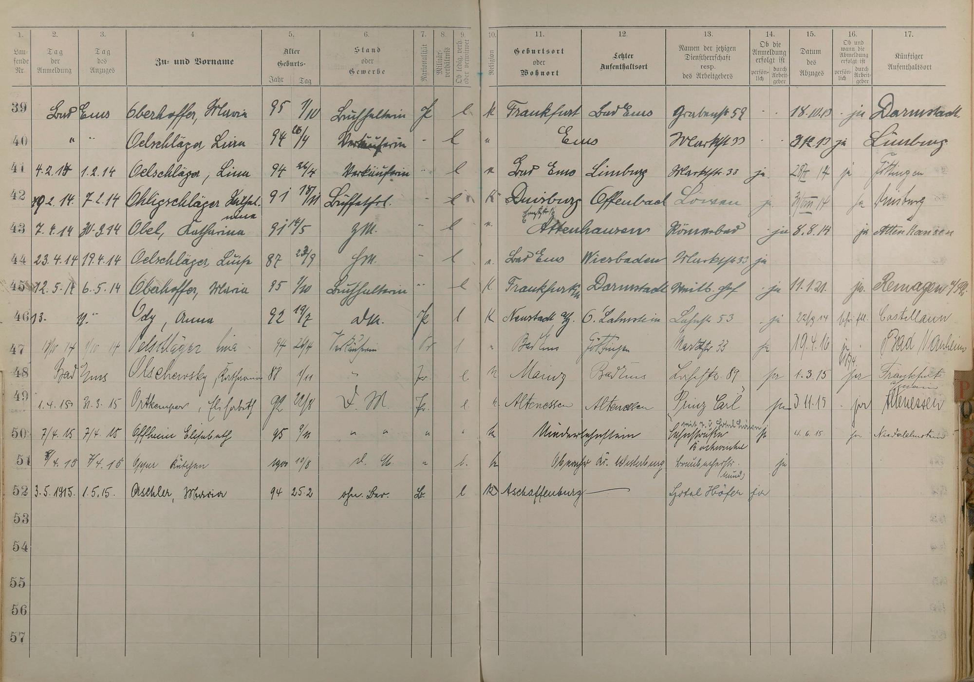 Melderegister der Gewerbegehilfinnen, Gesellinnen und Dienstbotinnen 1911 - Apr. 1915