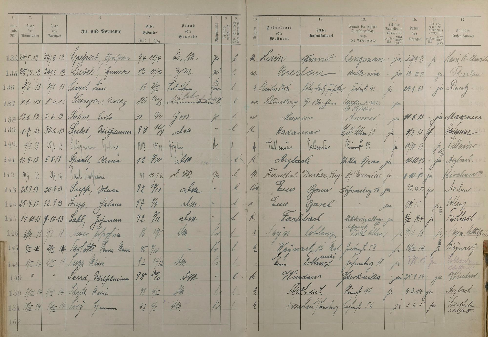 Melderegister der Gewerbegehilfinnen, Gesellinnen und Dienstbotinnen 1911 - Apr. 1915