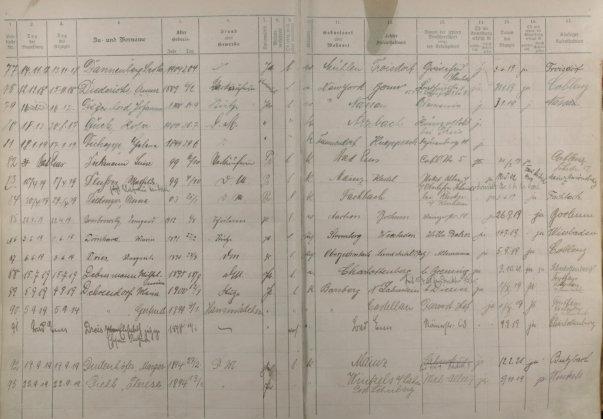 Melderegister der Gewerbegehilfinnen, Gesellinnen und Dienstbotinnen Mai 1915 - Mai 1923