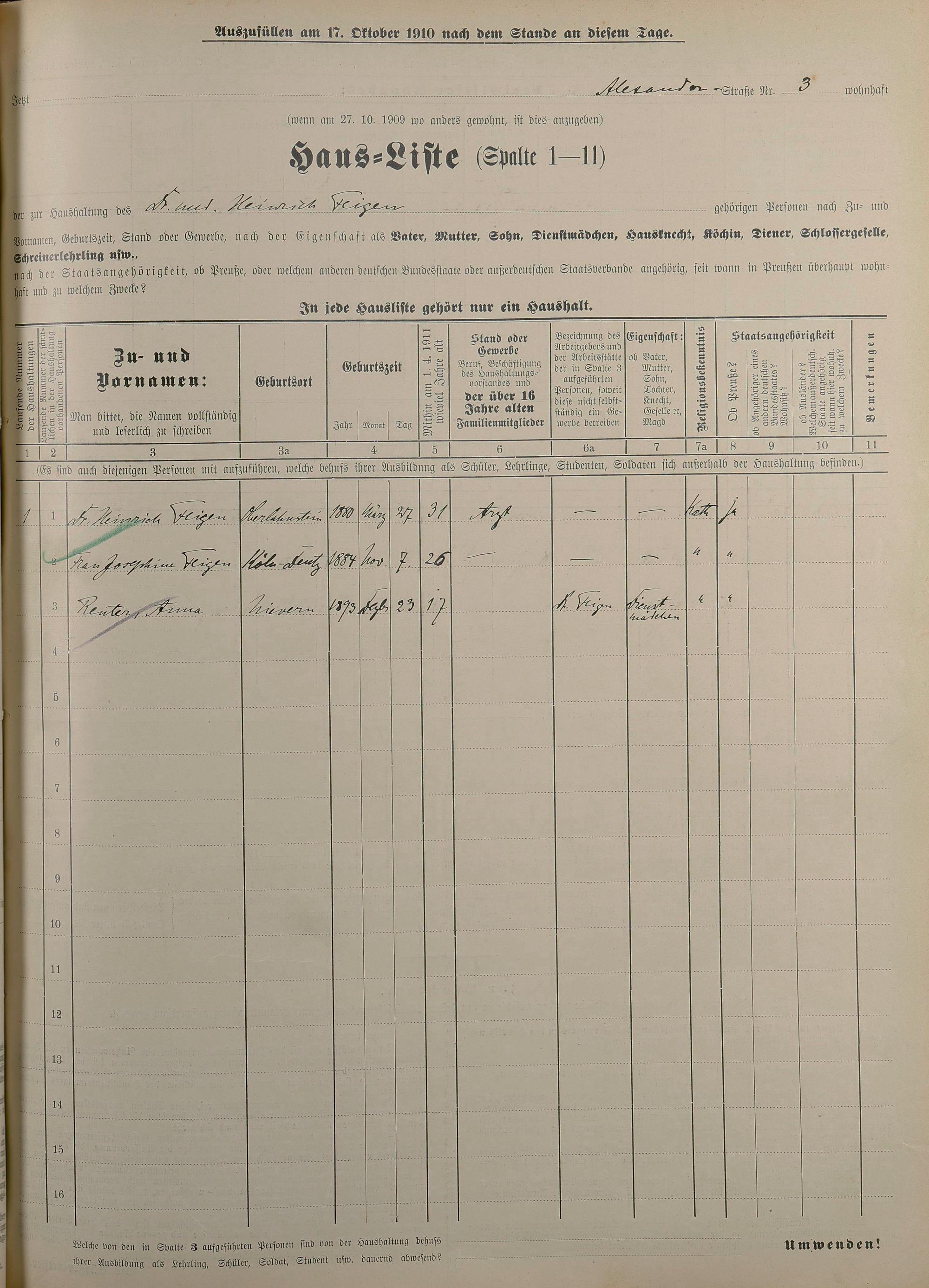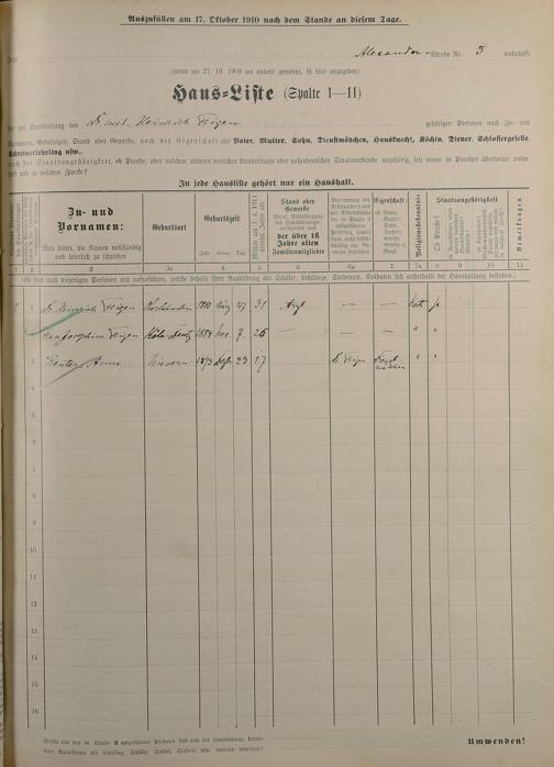Personenstandsaufnahme zur Klassensteuerrolle für 1910