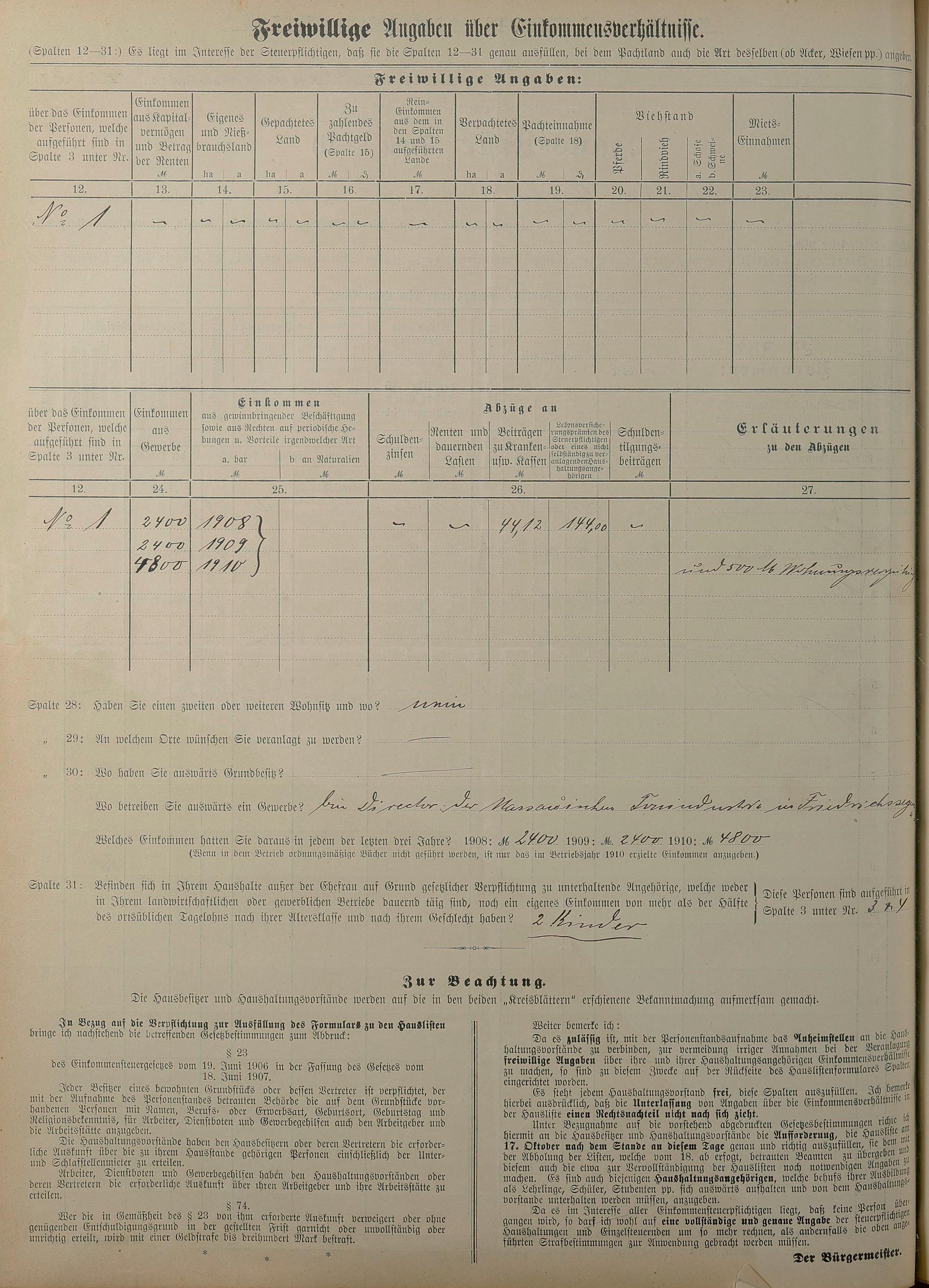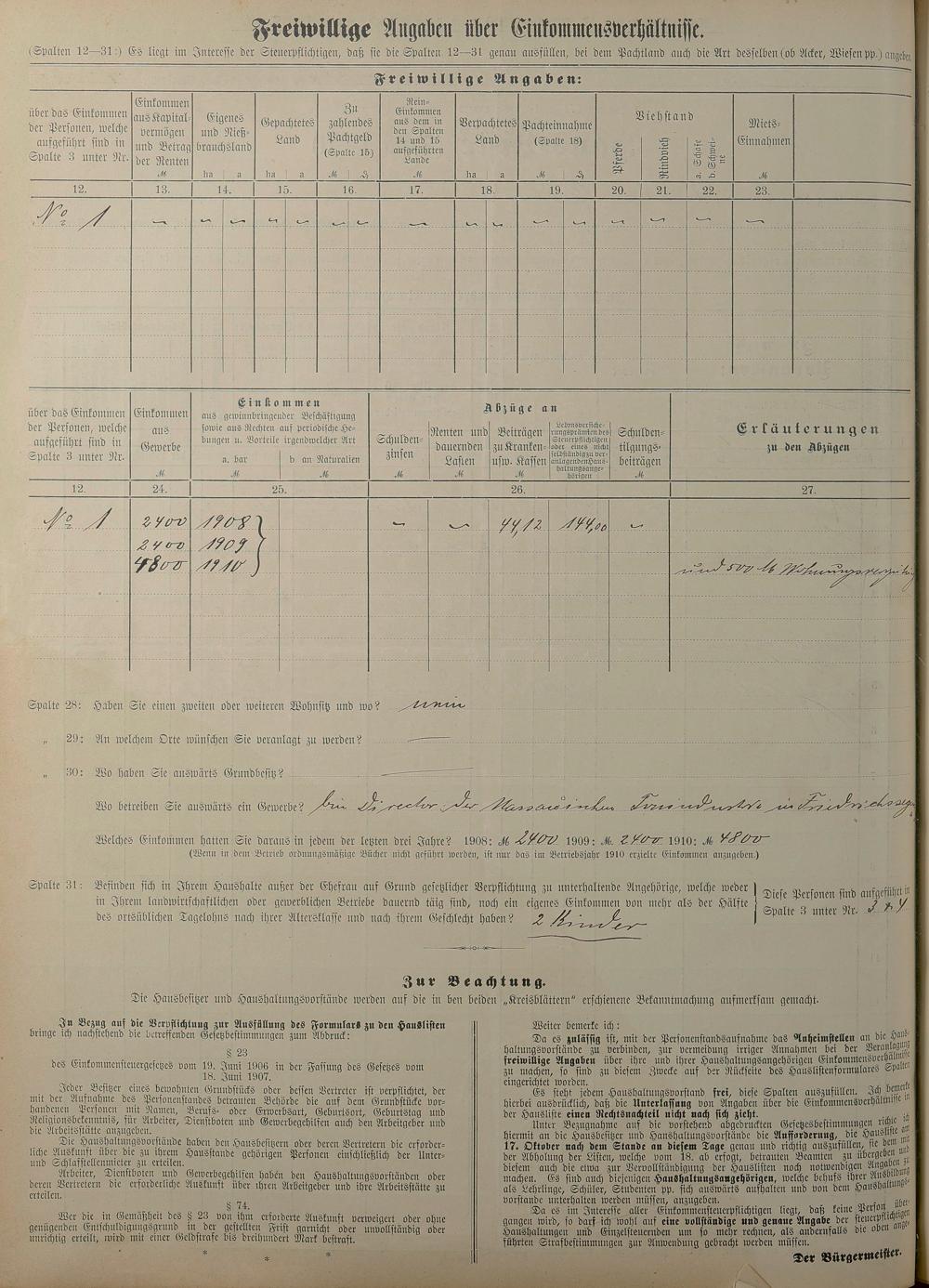 Personenstandsaufnahme zur Klassensteuerrolle für 1910